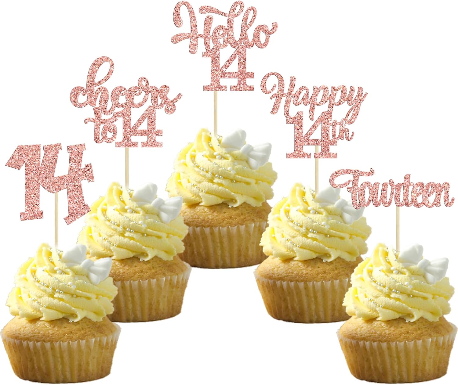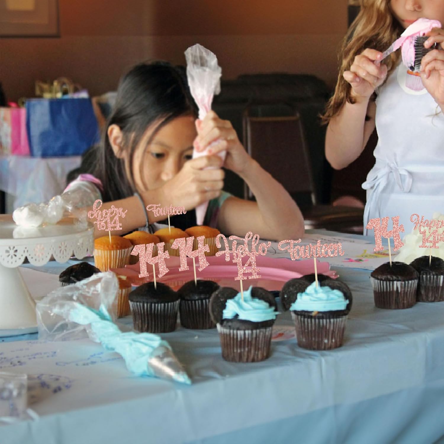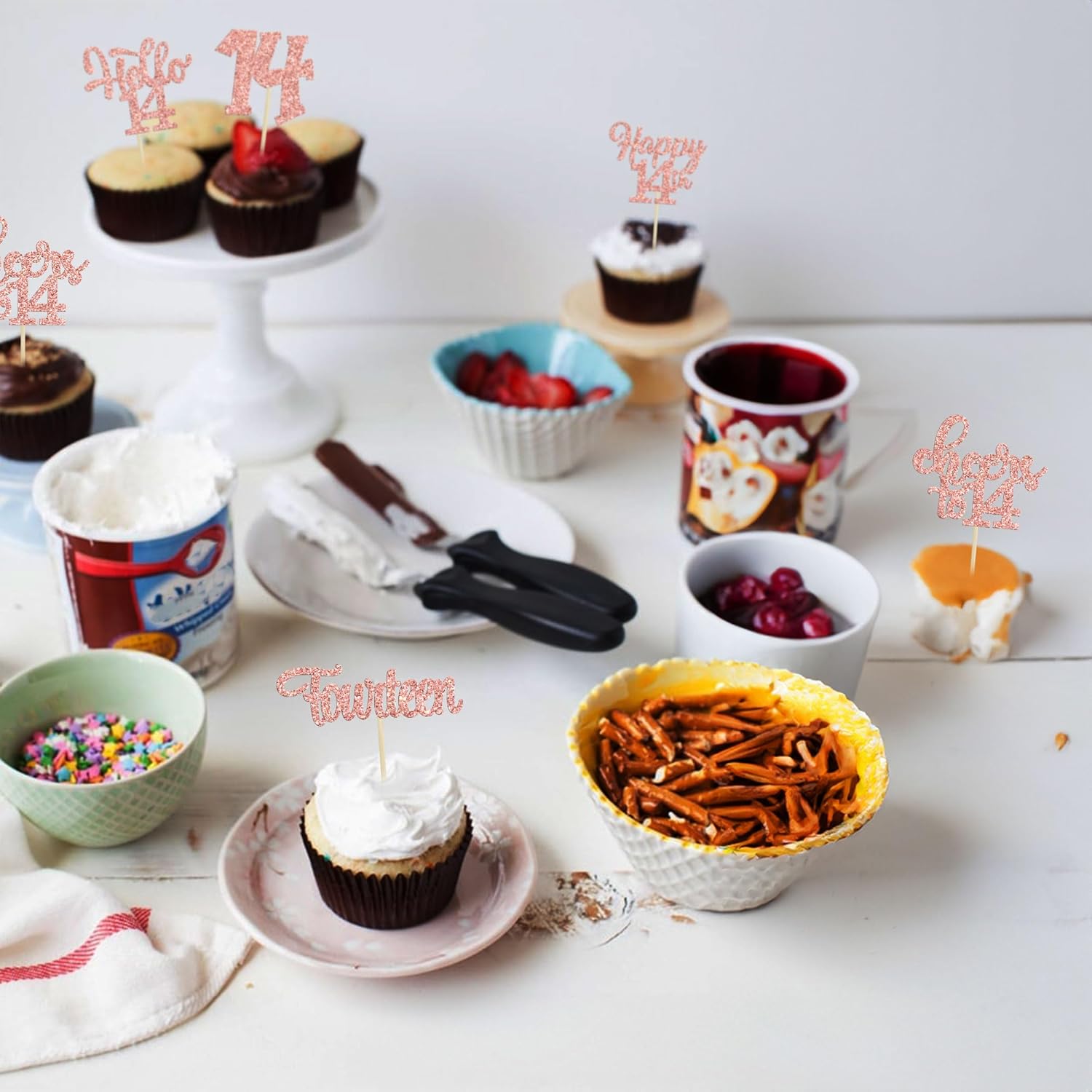 30Pcs 14th Birthday Cupcake Toppers Hello 14 Cupcake Picks Fourteen Cheers to 14 Years Old Cake Decorations for 14th Birthday Anniversary Party Supplies Rose Gold Glitter