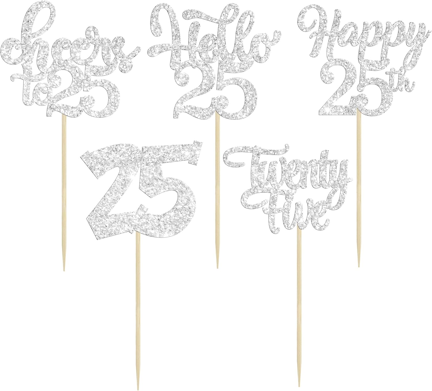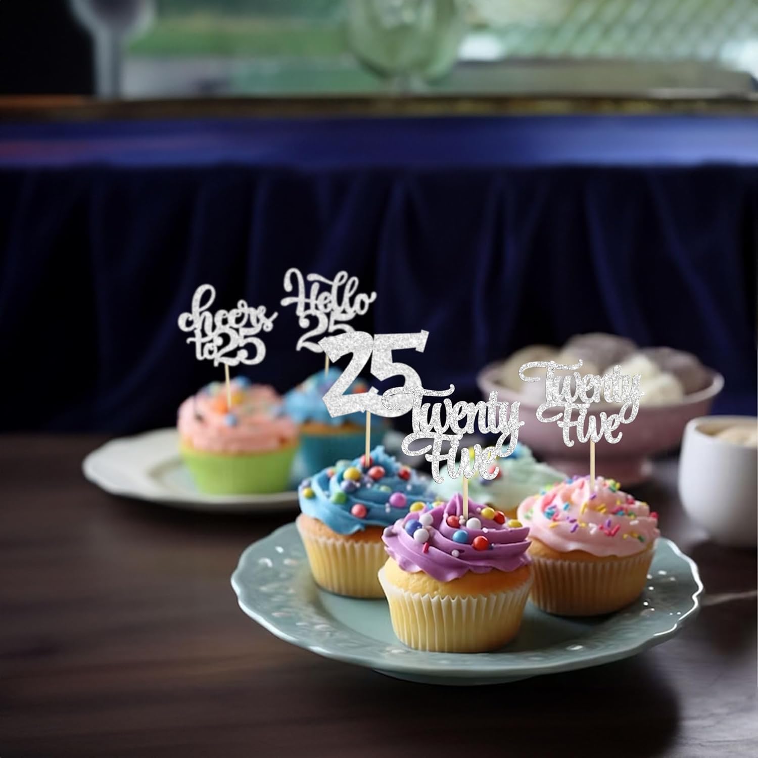 30pcs 25th Birthday Cupcake Toppers - Silver Glitter Cheers to 25 Years Old Cake Decorations for 25th Birthday Anniversary Party Supplies