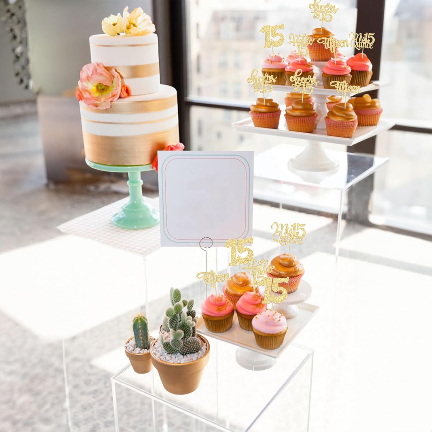 30Pcs 15th Birthday Cupcake Toppers Fifteen Cupcake Picks Cheers to 15 Years Old Mis Quince 15 Cake Decorations for 15th Birthday Anniversary Party Gold Glitter