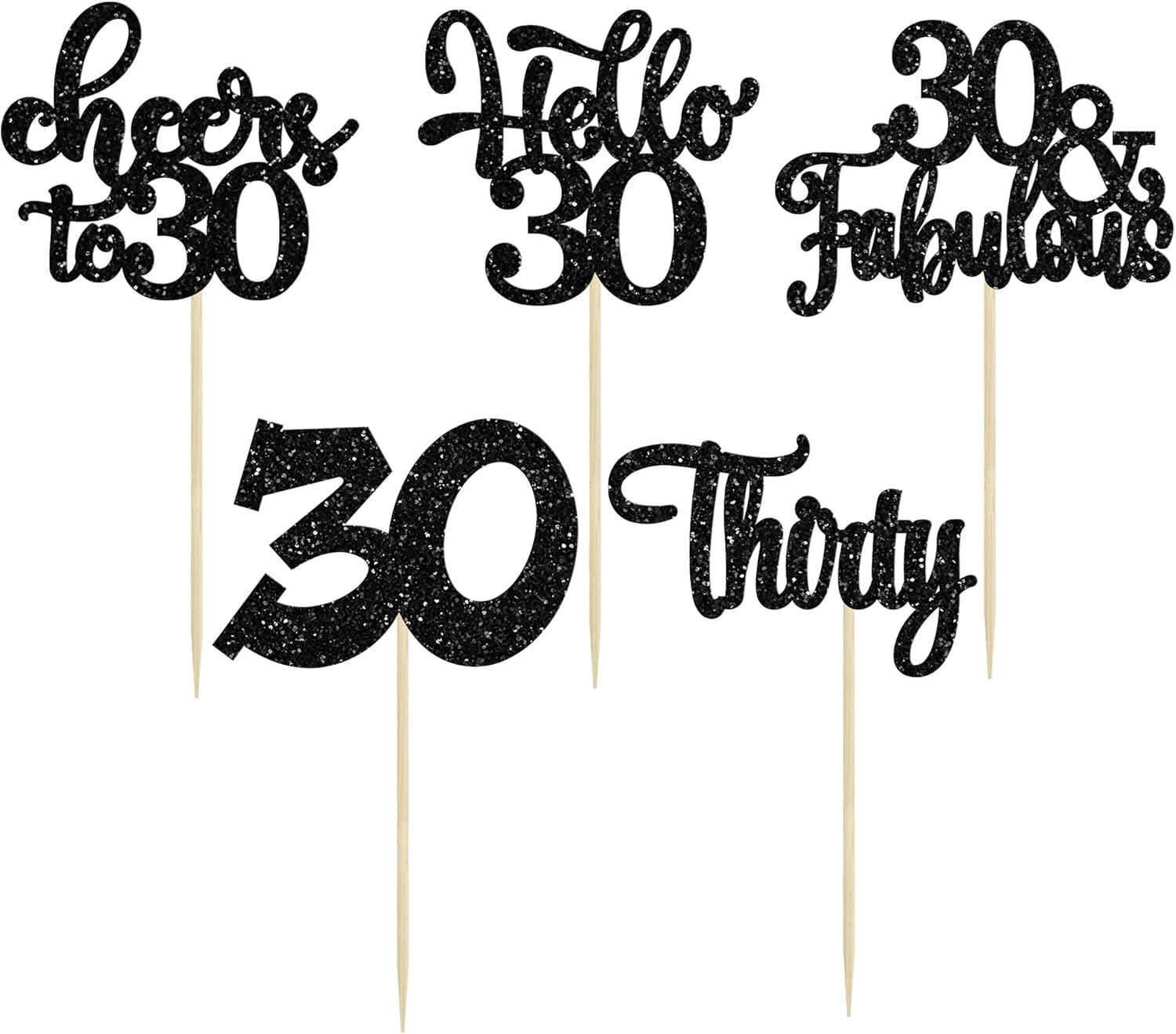 30Pcs Happy 30th Birthday Cupcake Toppers Black Glitter Thirty Cheers to 30 Birthday Cupcake Picks for Happy 30th Birthday Anniversary Party Cake Decorations Supplies