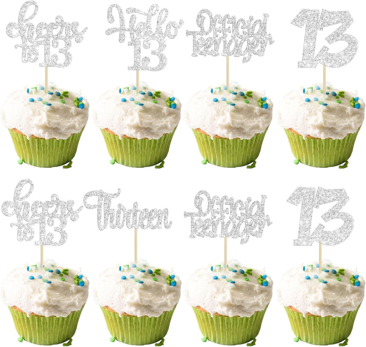 30Pcs 13th Birthday Cupcake Toppers Hello 13 Cupcake Picks Official Teenager Cheers to 13 Years Old Cake Decorations for 13th Birthday Anniversary Party Supplies Silver Glitter