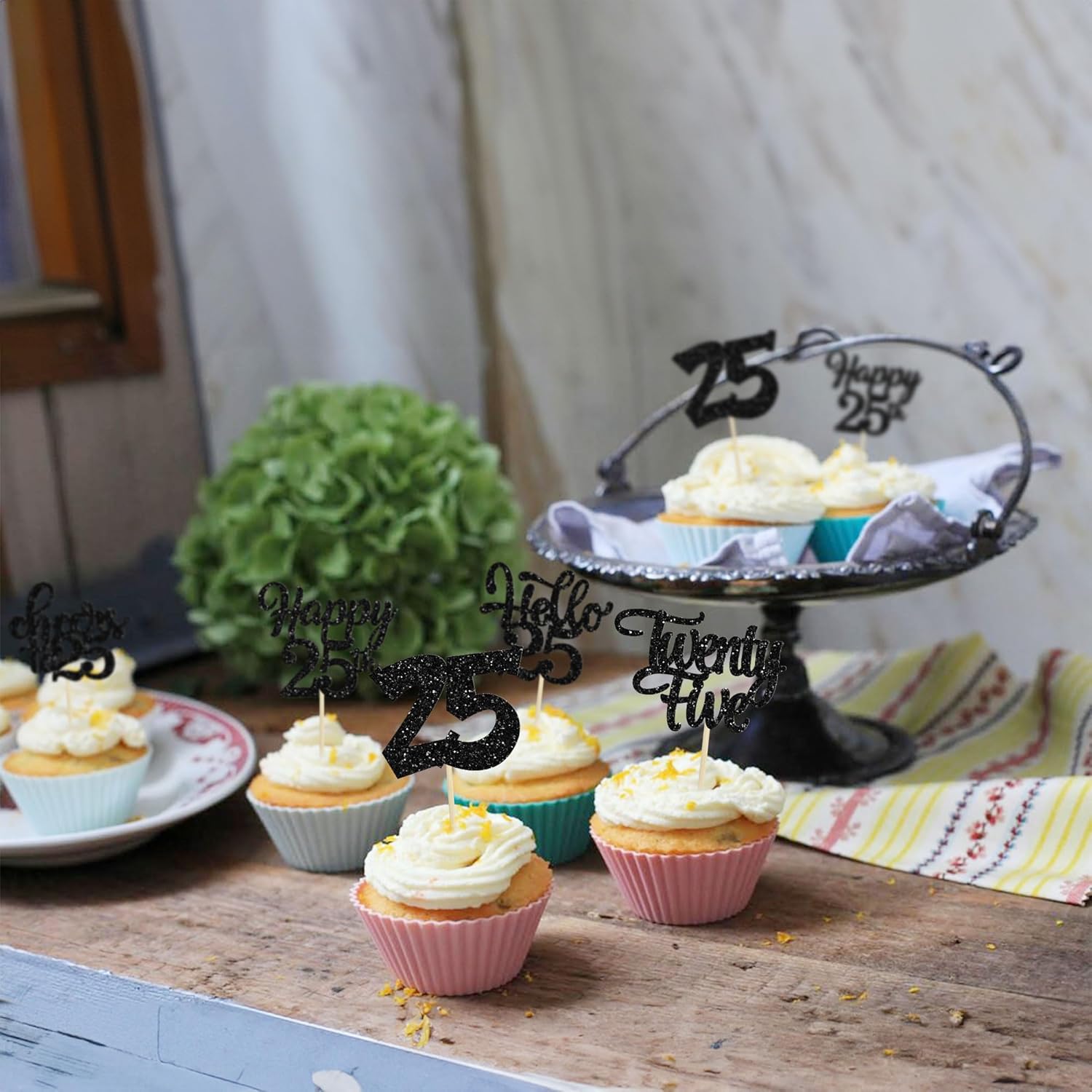 30pcs 25th Birthday Cupcake Toppers - 25th Anniversary Cake Decorations with Black Glitter