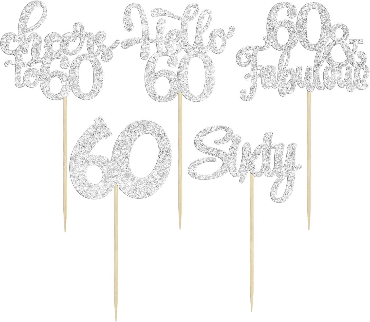 30Pcs Happy 60th Birthday Cupcake Toppers Silver Glitter Sixty Cake Toppers Cheers to 60 Years Old Birthday Cupcake Picks for 60th Birthday Anniversary Party Cake Decorations Supplies