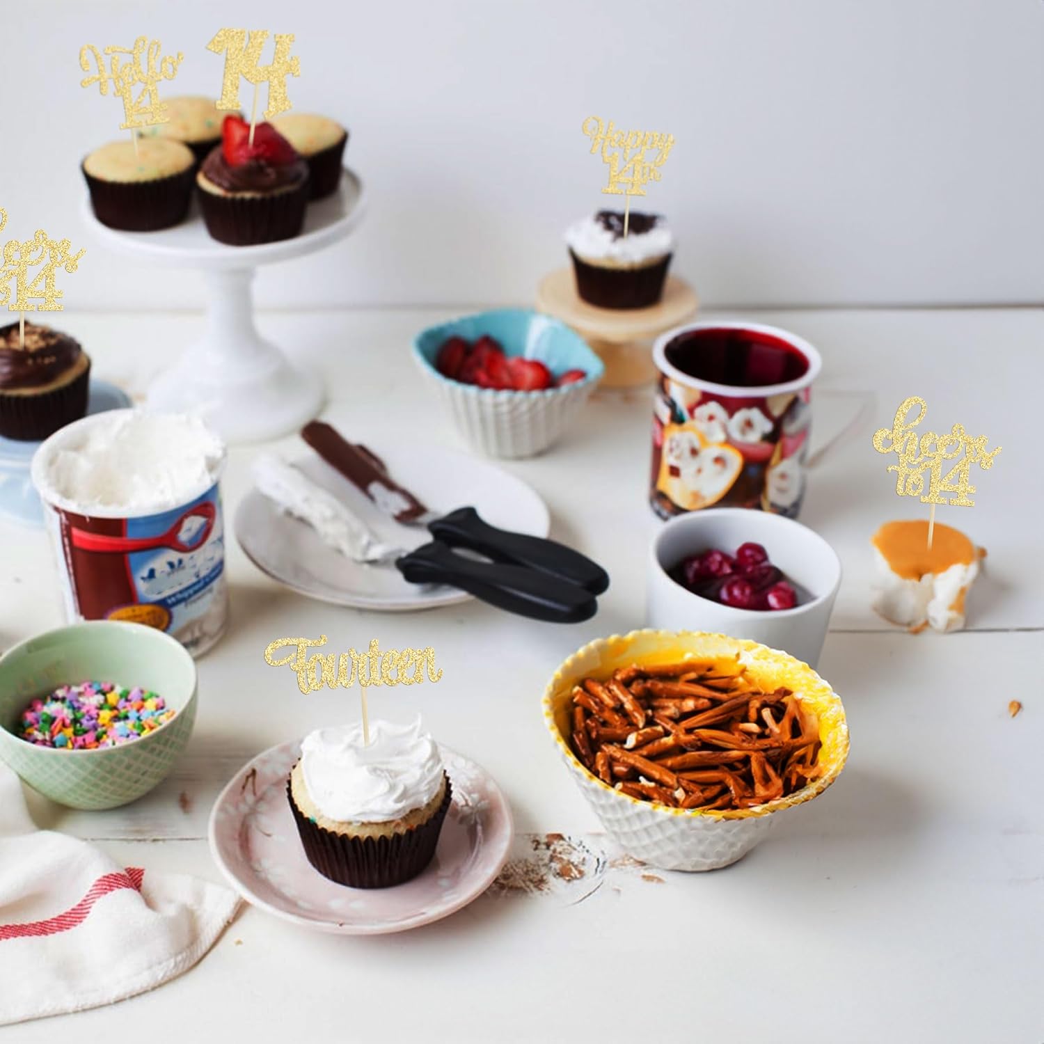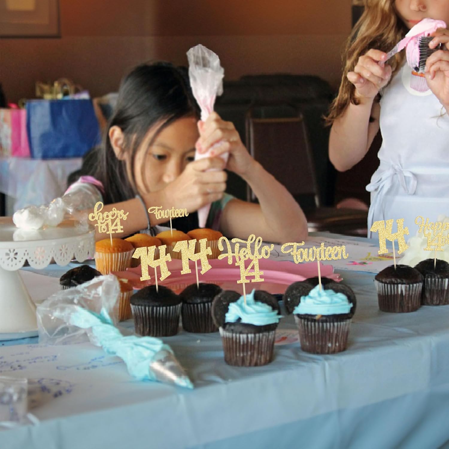 30Pcs 14th Birthday Cupcake Toppers Hello 14 Cupcake Picks Fourteen Cheers to 14 Years Old Cake Decorations for 14th Birthday Anniversary Party Supplies Gold Glitter