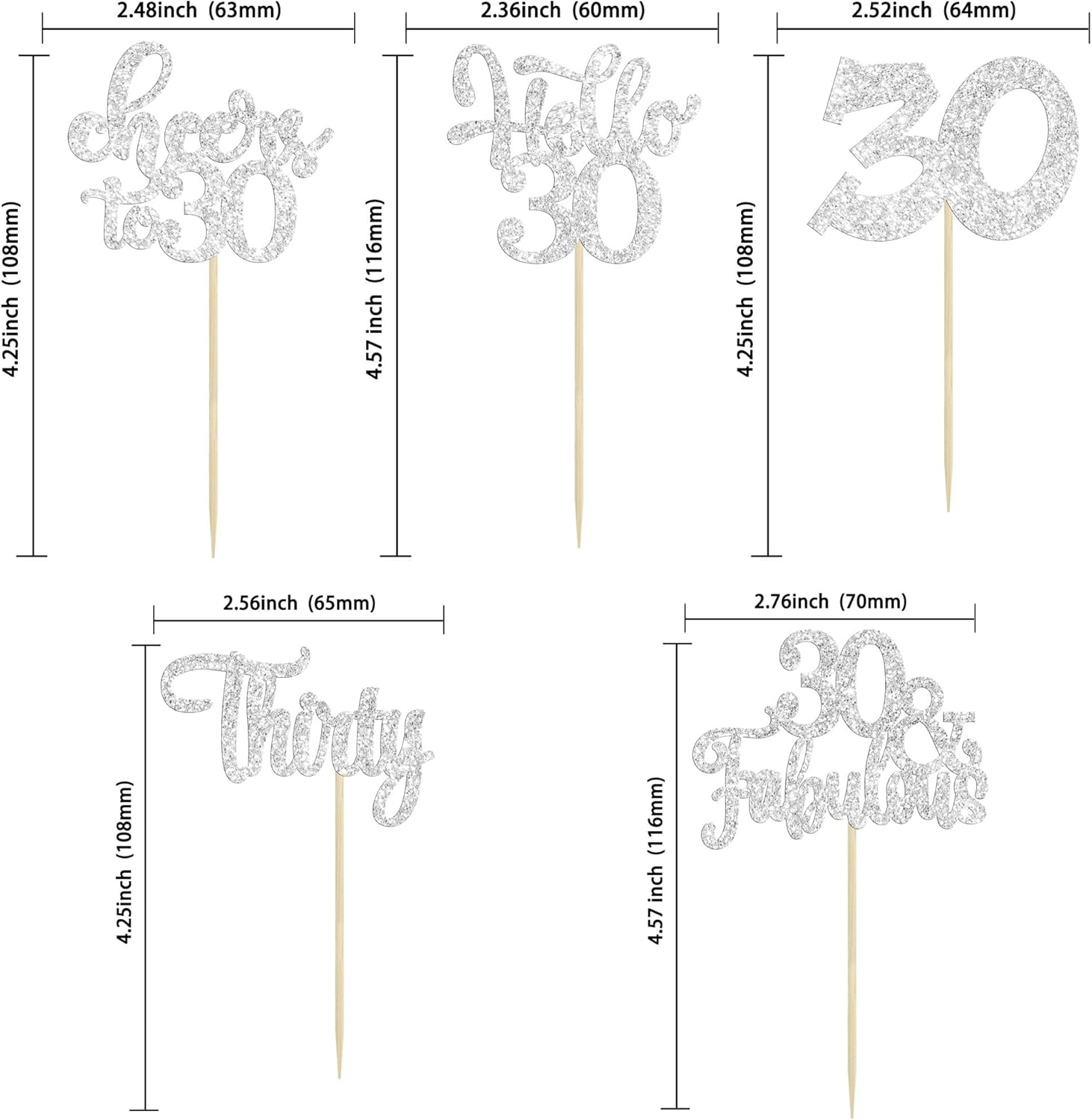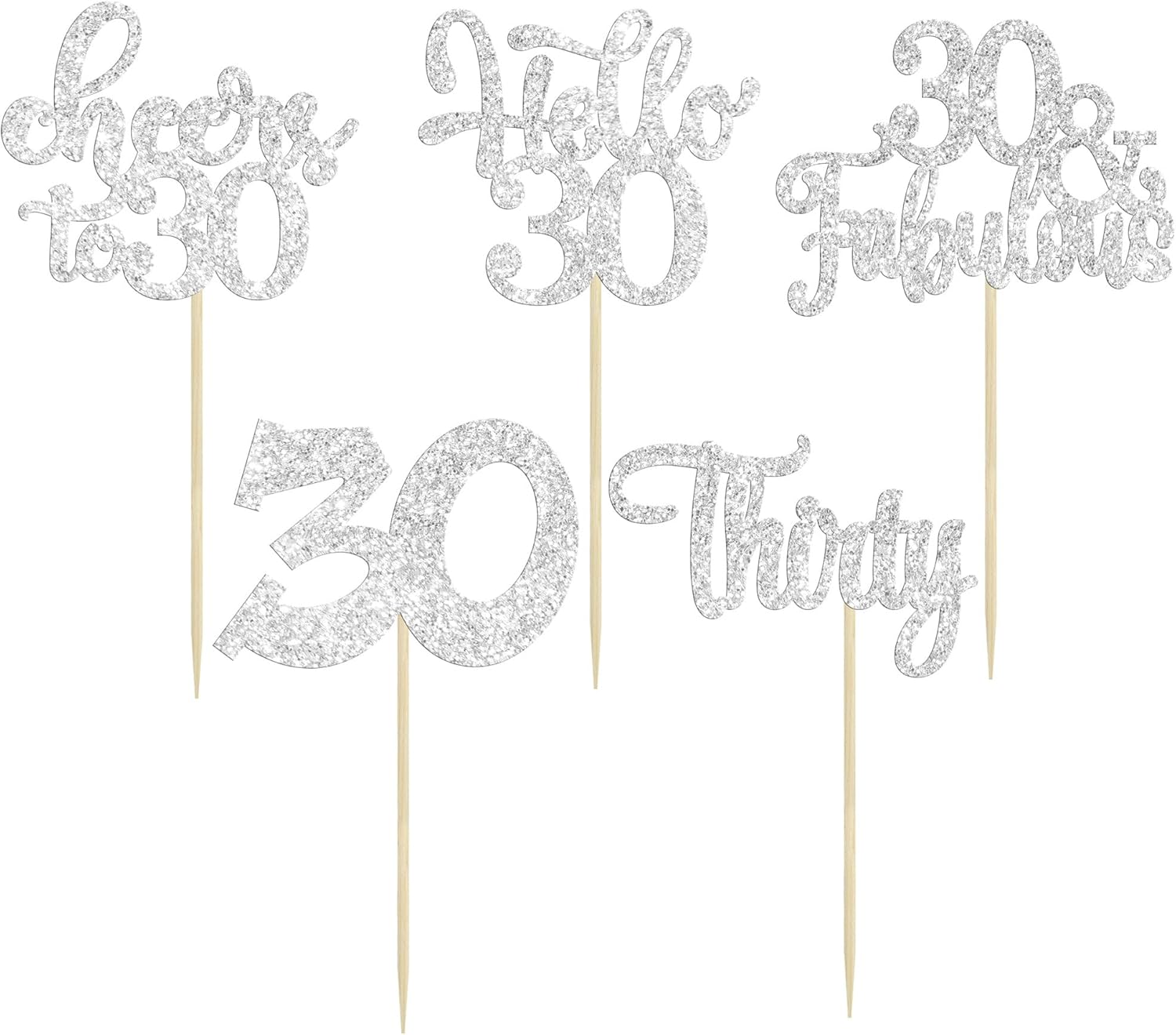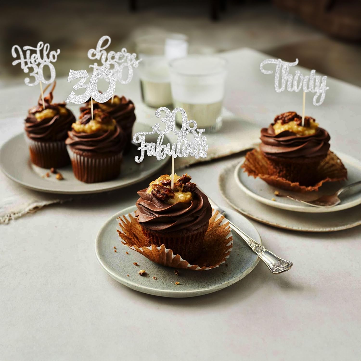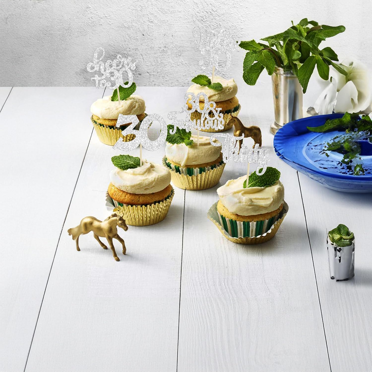 30Pcs Happy 30th Birthday Cupcake Toppers Silver Glitter Thirty Cheers to 30 Birthday Cupcake Picks for Happy 30th Birthday Anniversary Party Cake Decorations Supplies