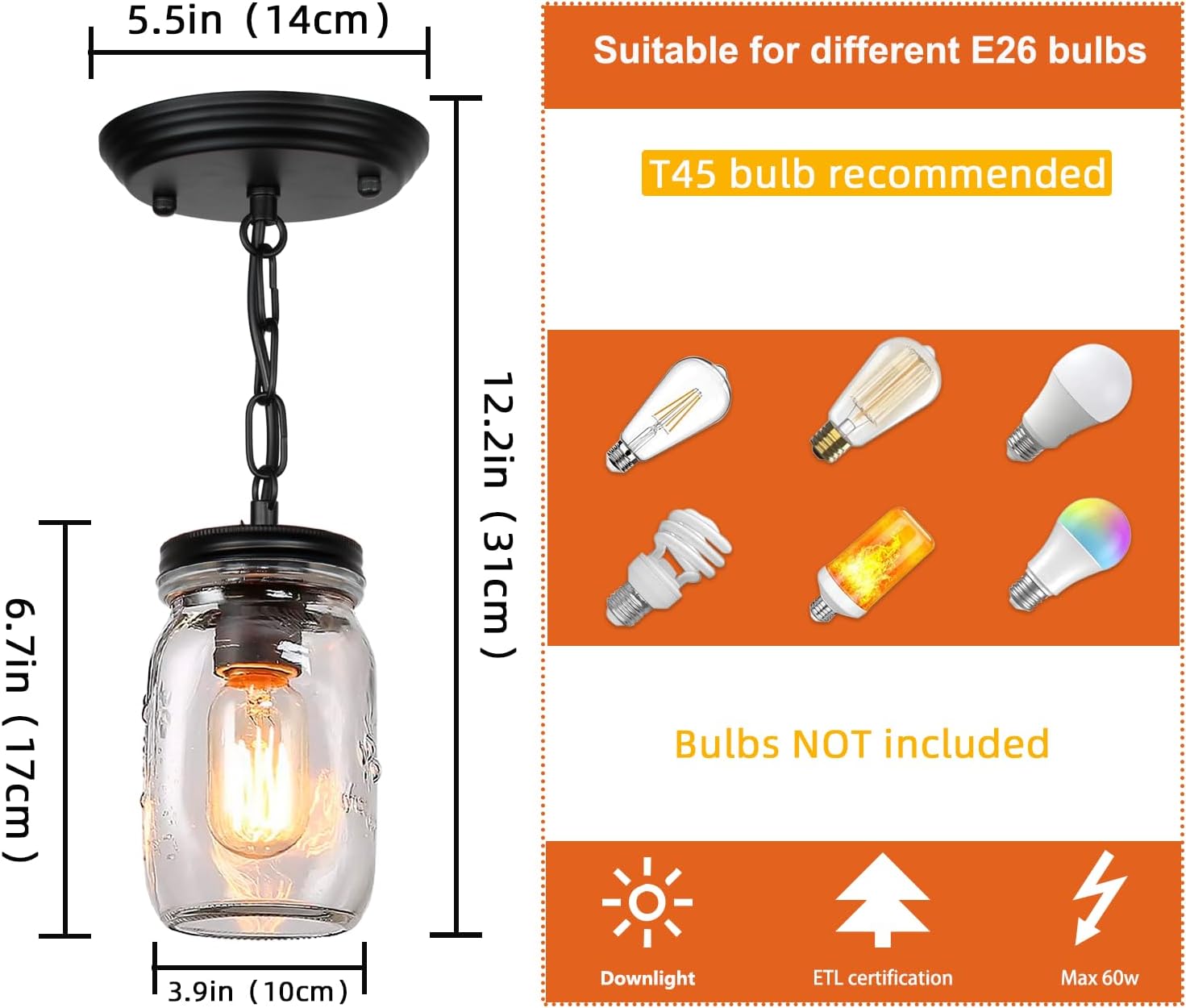 - 🔆Bulb Requirements🔆 --The pendant light fits all kinds of E26 light bulbs, such as Edison light bulbs, LED light bulbs, energy-saving bulbs, and incandescent bulbs. It has a maximum wattage of 60W per bulb (bulb not included), and a T45 bulb is recommended.