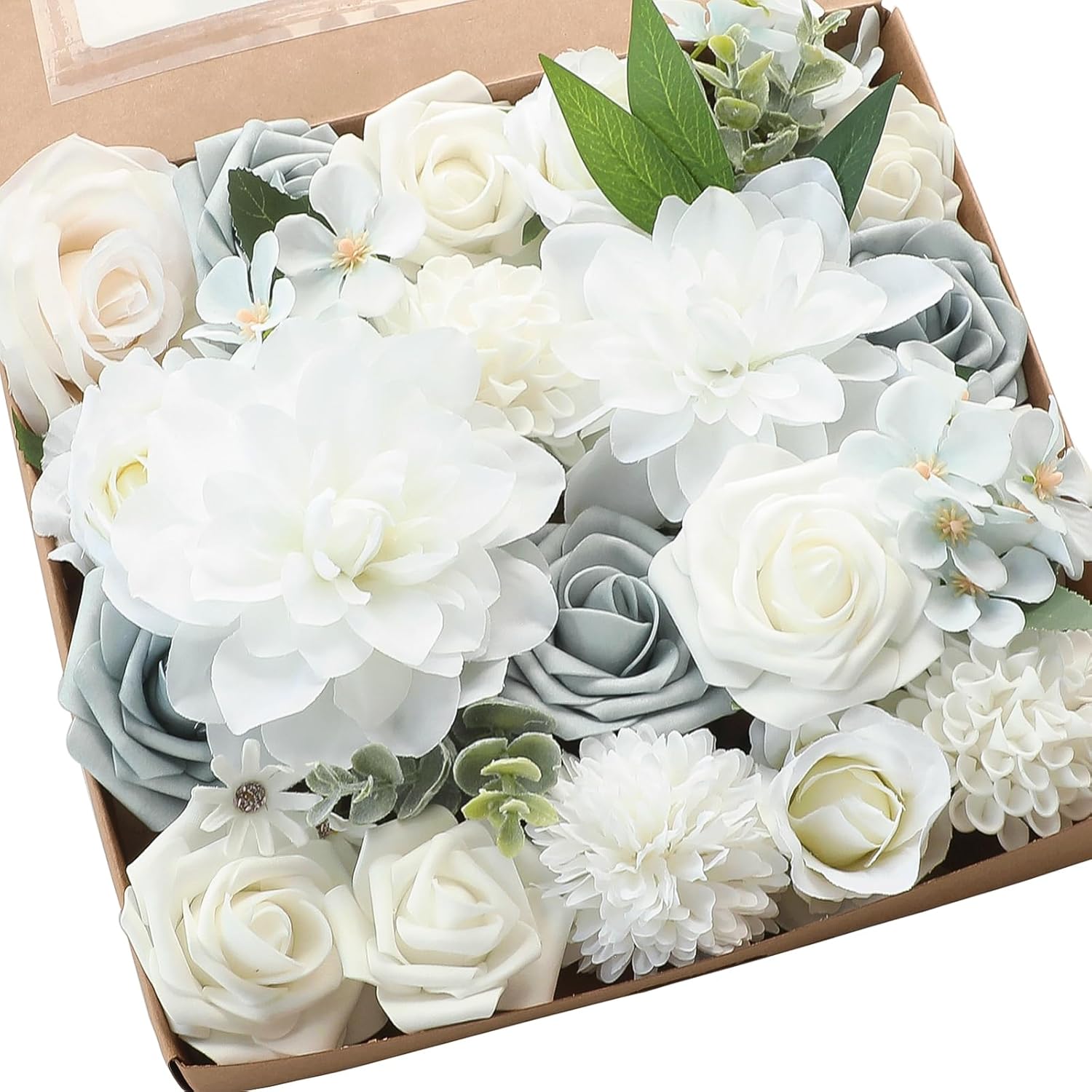 Floroom Powder Blue Ivory Artificial Flowers Fake Roses Dahlias and Greenery Combo Box Set for DIY Wedding Bouquets Bridal Shower Centerpieces Floral Arrangements Party Tables Home Decorations