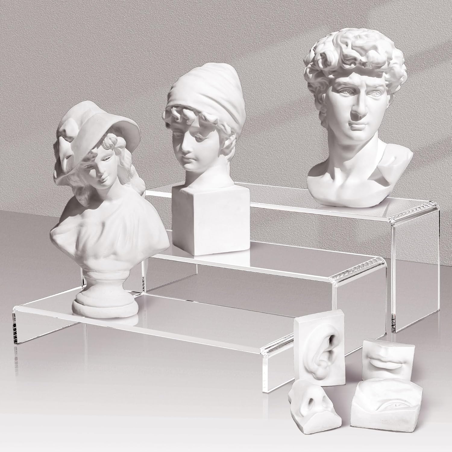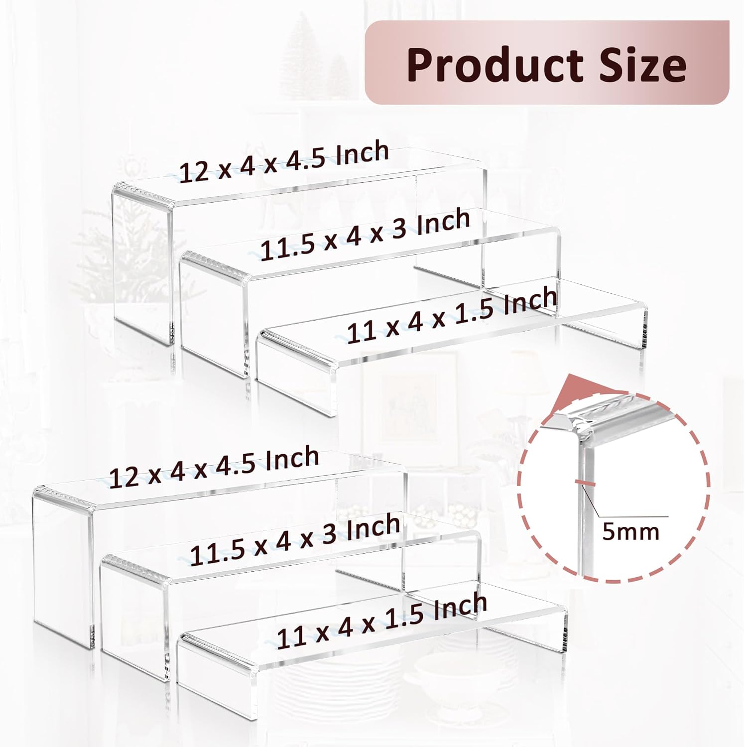 - 【MULTIPLE DISPLAY LAYERS】Includes 6 pack of acrylic risers. Available in 3 different sizes (Small: 11" L x 4" W x 1.5" H, Medium: 11.5" L x 4" W x 3" H, Large: 12" L x 4" W x 4.5" H), each with 2 pieces in each size, you'll have enough display layers to showcase your items. 3 different heights can be displayed together like steps, or can be arranged individually or staggered. You can use your imagination and combine them freely. 4" width accommodates more and larger items