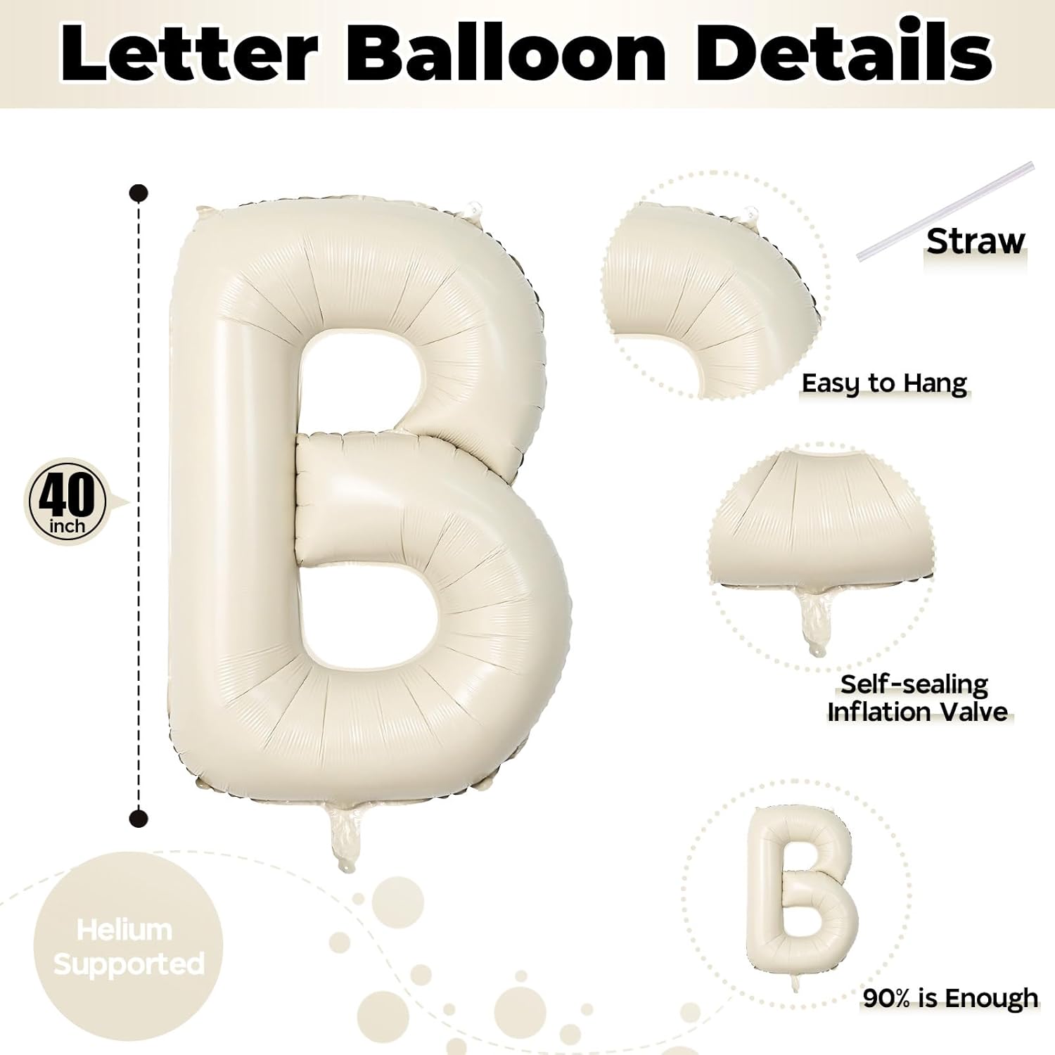 - ๐ What You Get: Our product package includes 1pcs 40 inch "B" letter foil cream white balloon and 1pcs convenient straw for inflate. You can choose any big letter balloons to combine and customize the word you want to form. Make your party more unique and meaningful.