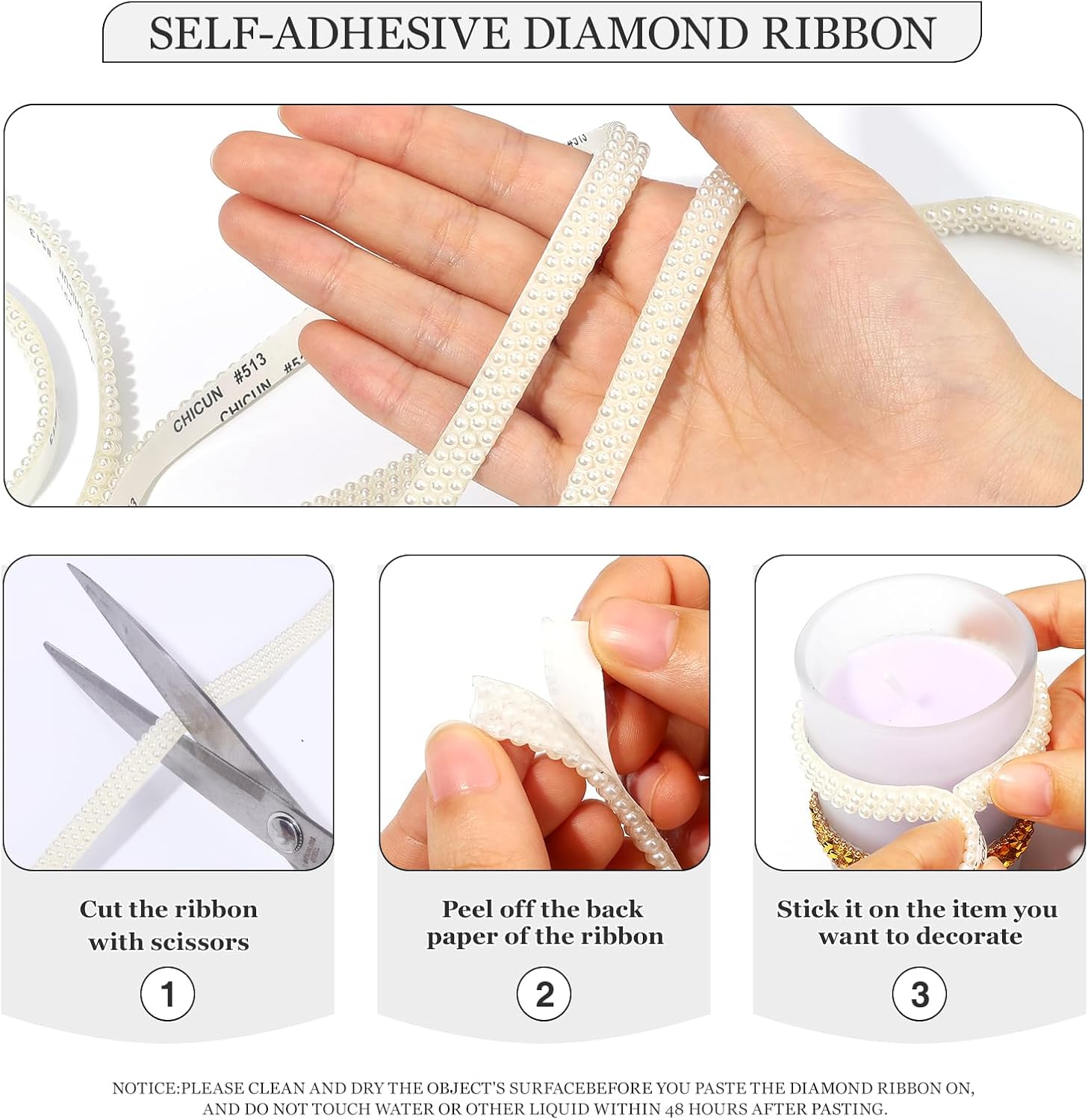 - Self-Adhesive Pearls Ribbon: The self-adhesive design with backing glue makes it possible to stick anywhere as long as the surface is smooth and clean. You cut the pearls ribbon into different lengths with scissors, then peel off the back paper of the sticker and paste it on the project you want to decorate.