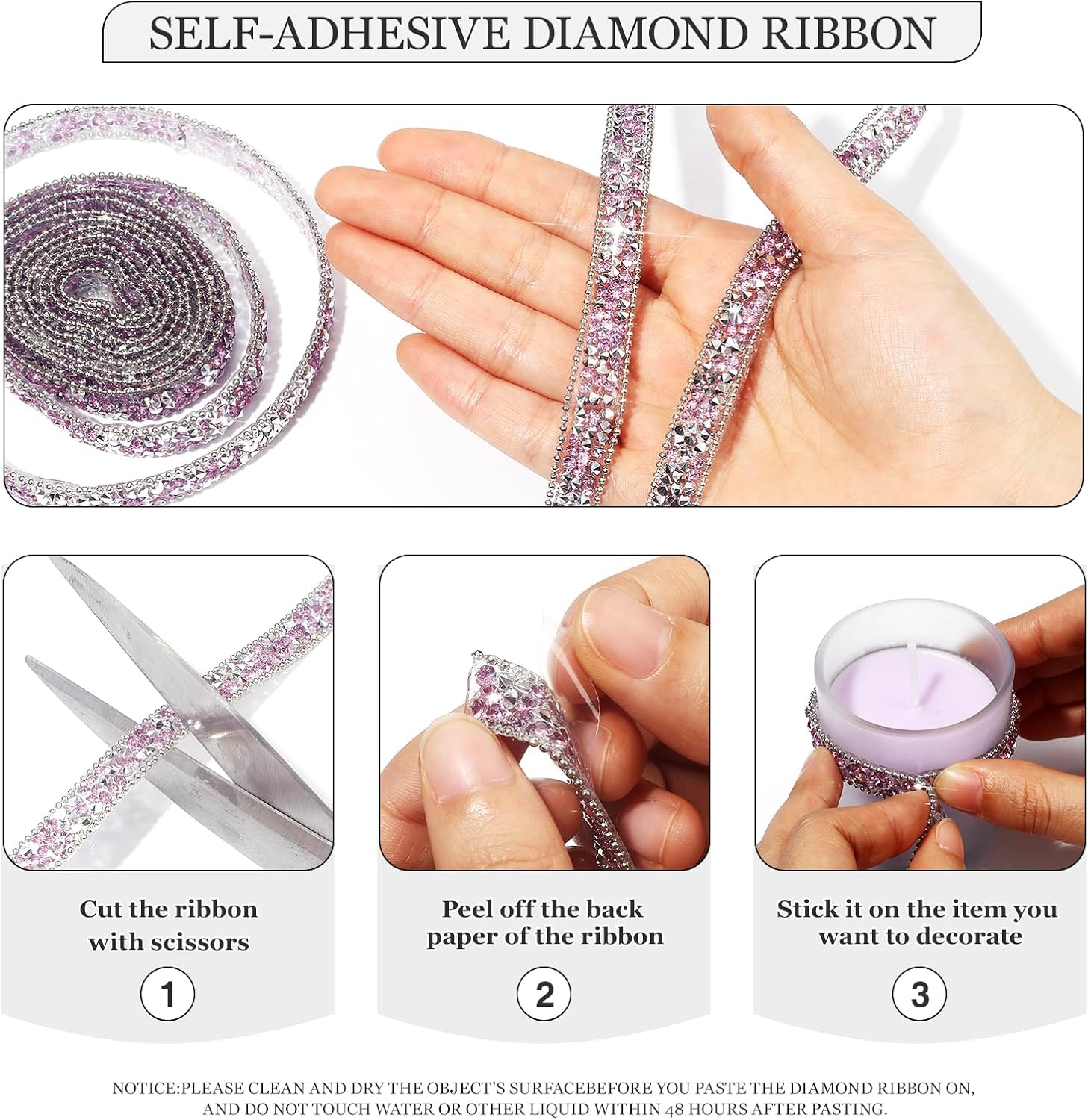 - Self-Adhesive Diamond Ribbon: The self-adhesive design with backing glue makes it possible to stick anywhere as long as the surface is smooth and clean. You cut the rhinestone ribbon into different lengths with scissors, then peel off the back paper of the sticker and paste it on the project you want to decorate.
