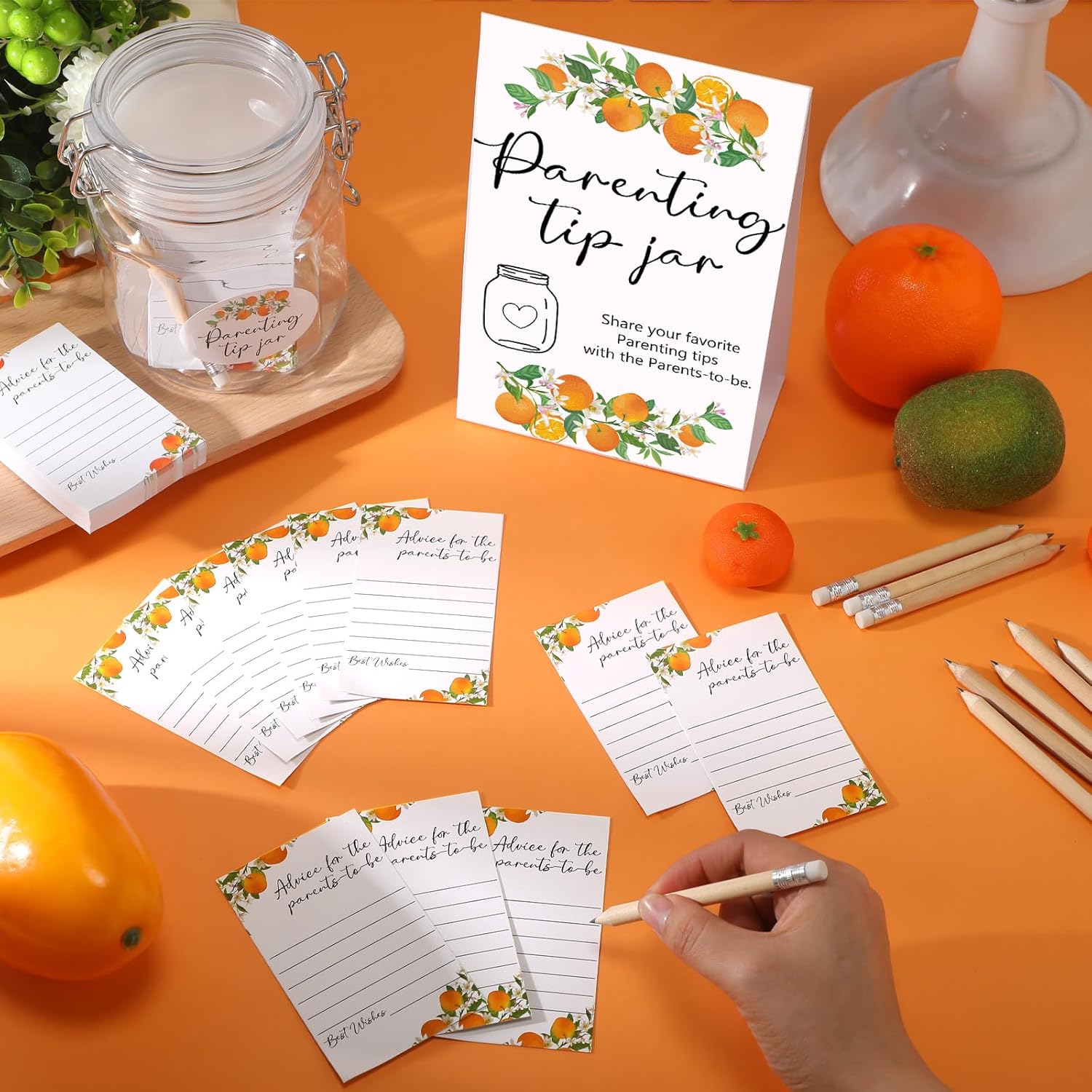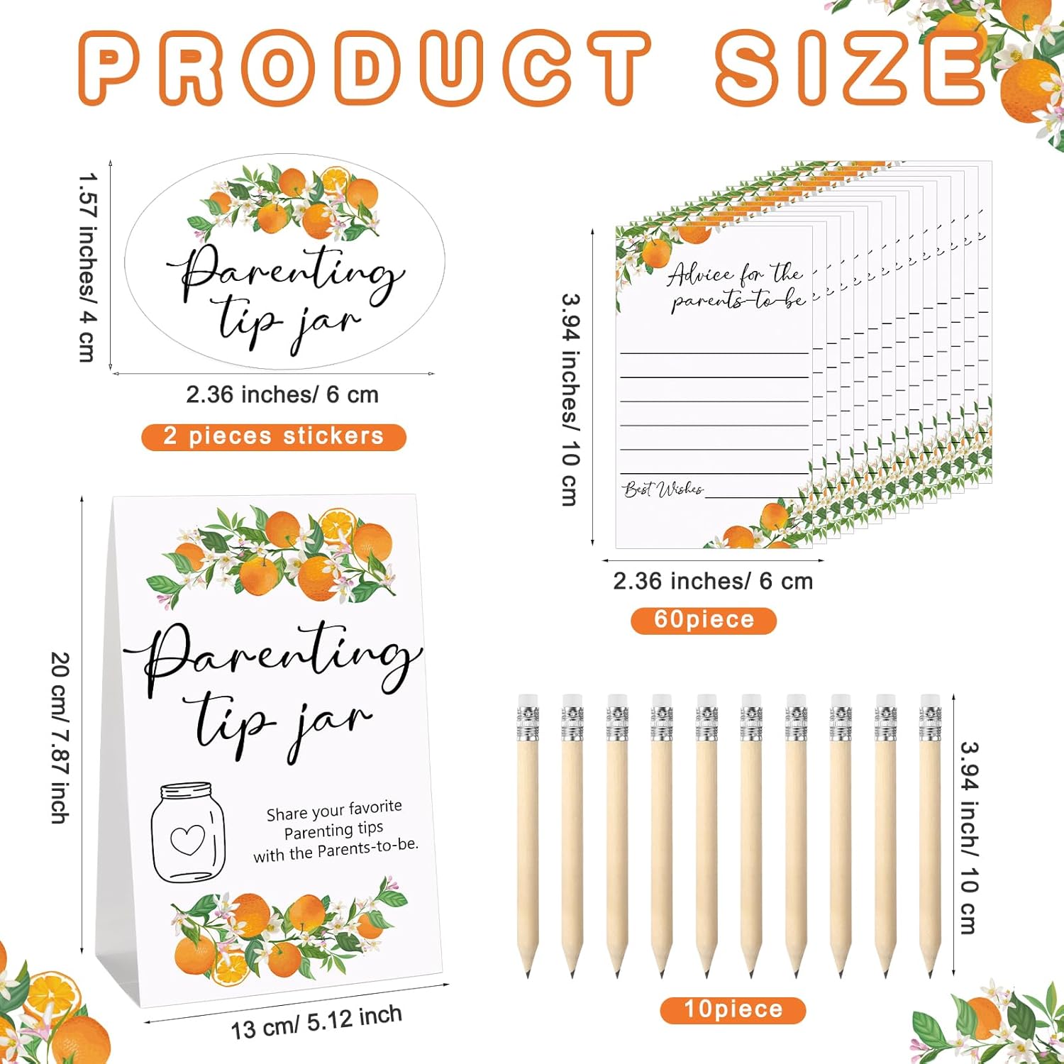 - Baby Shower Cards Set: the package contains 1 piece of parenting tip jar sign, 60 pieces of tips cards for the parents to be, 10 pieces of pencils, 2 pieces of cute stickers, and 1 PET bottle, enough quantity and delicate design to meet your use needs