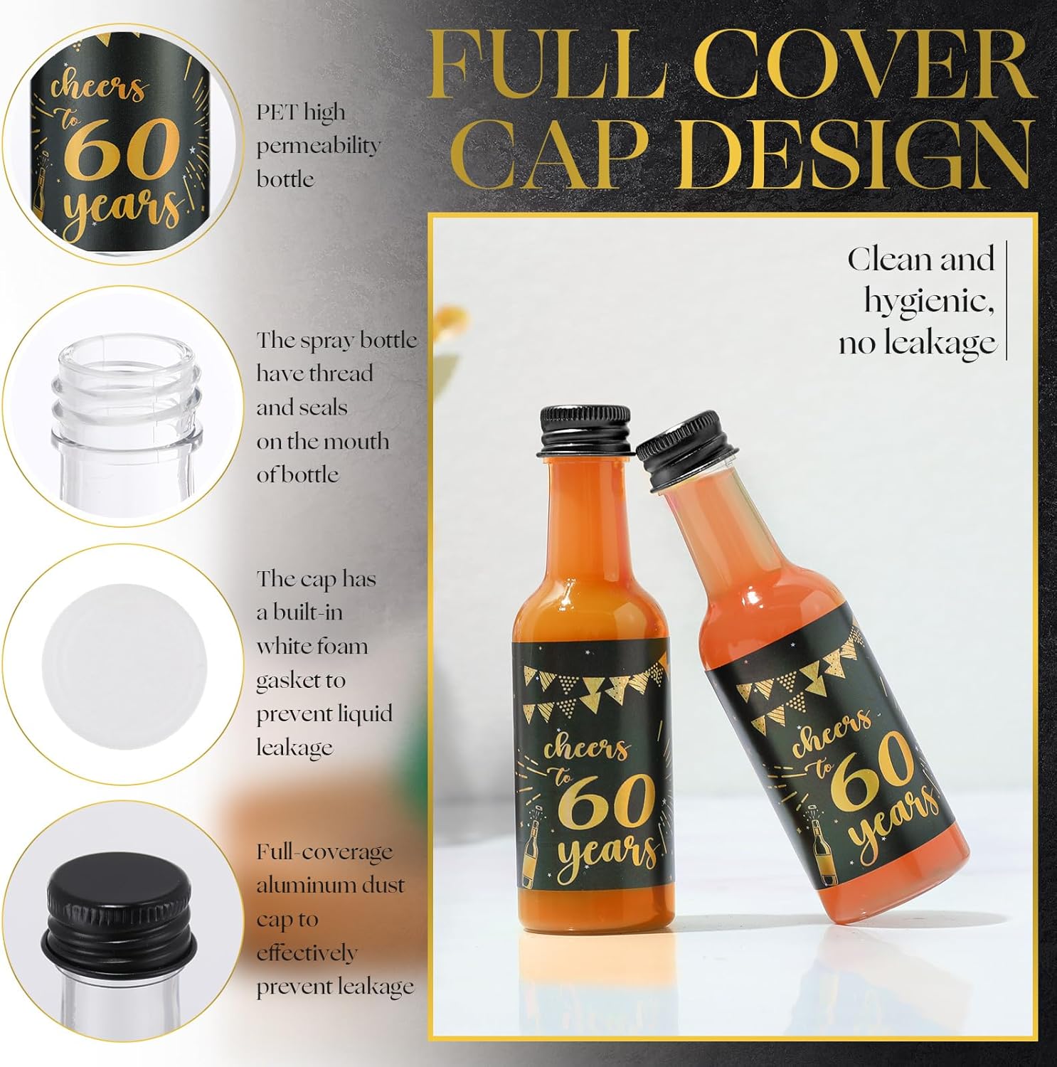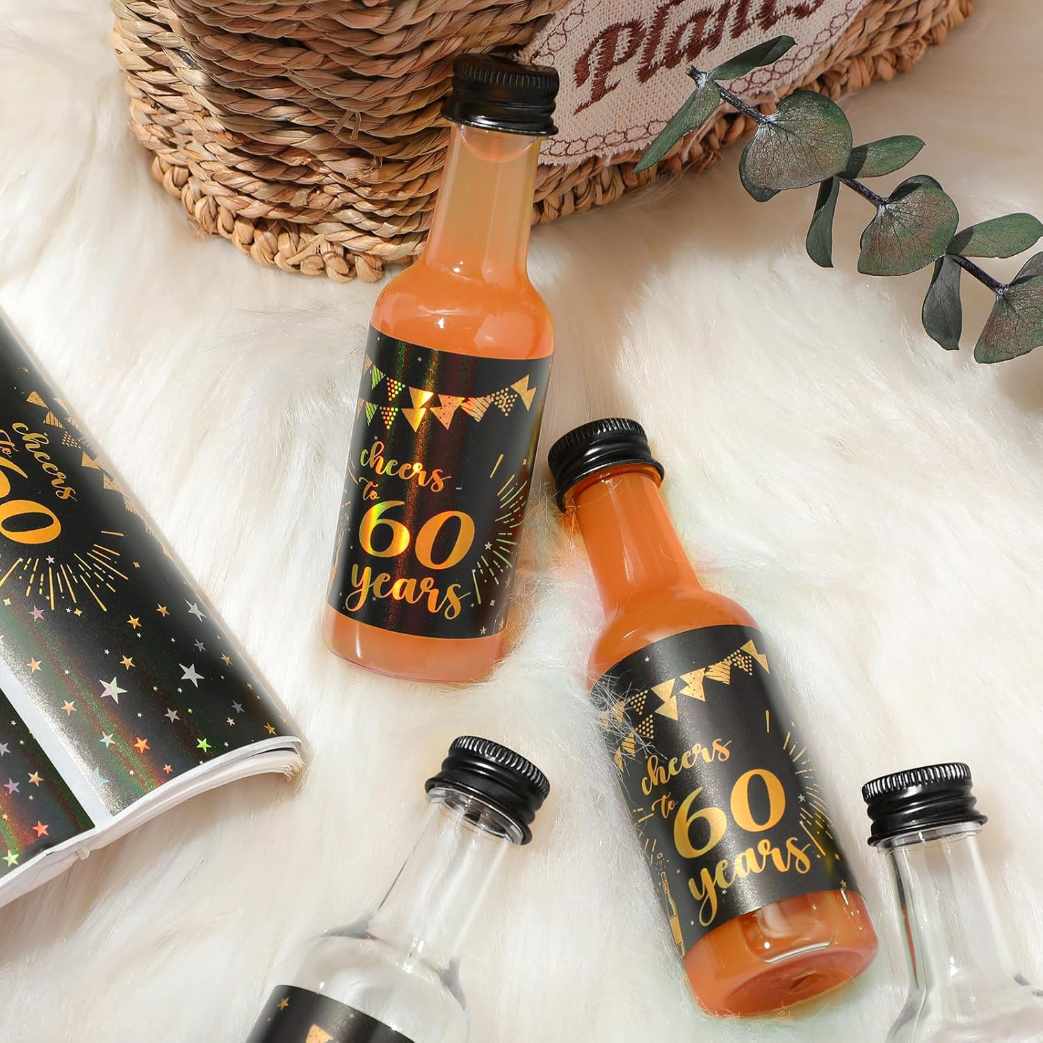 Vesici 50 Pack Mini Liquor Bottles 1.7oz Shot Mini Wine and Champagne Bottle Birthday Sticker with 2 Funnels Birthday Party Favor for Adult Guest Women Men Anniversary Celebration(Cheers to 60 Years)
