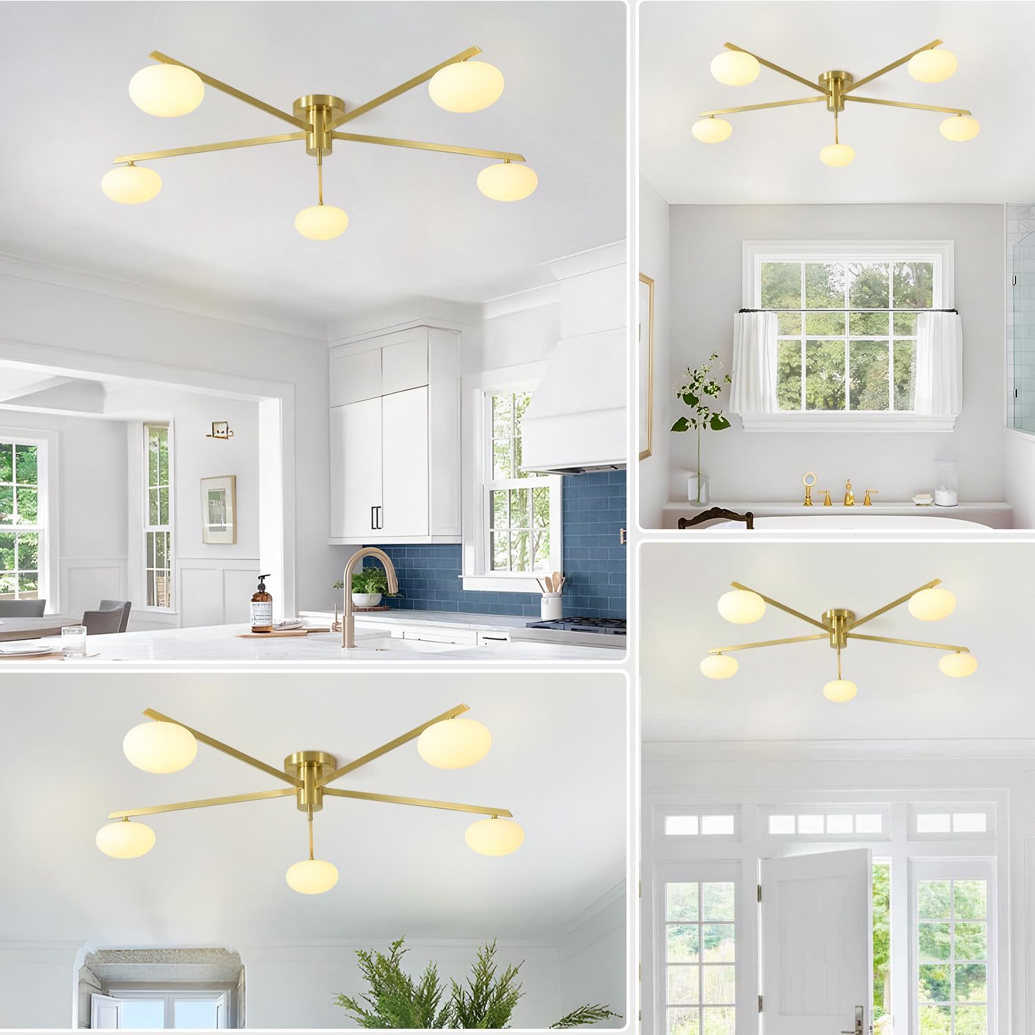 - Gold Semi Flush Mount Ceiling Light: This brass gold globe sputnik chandelier,it's made of high-quality metal and high light transmission milk glass globe shade, with smooth lines, minimalist style, brings classy looking to your home, idea for indoor decor. And this mid century modern light fixture flush mount fits any home decor style,creating a comfortable in your house. Perfect for your bedroom, dining room,living room,hallway,kitchen, beauty salon,bar,coffee house,etc.