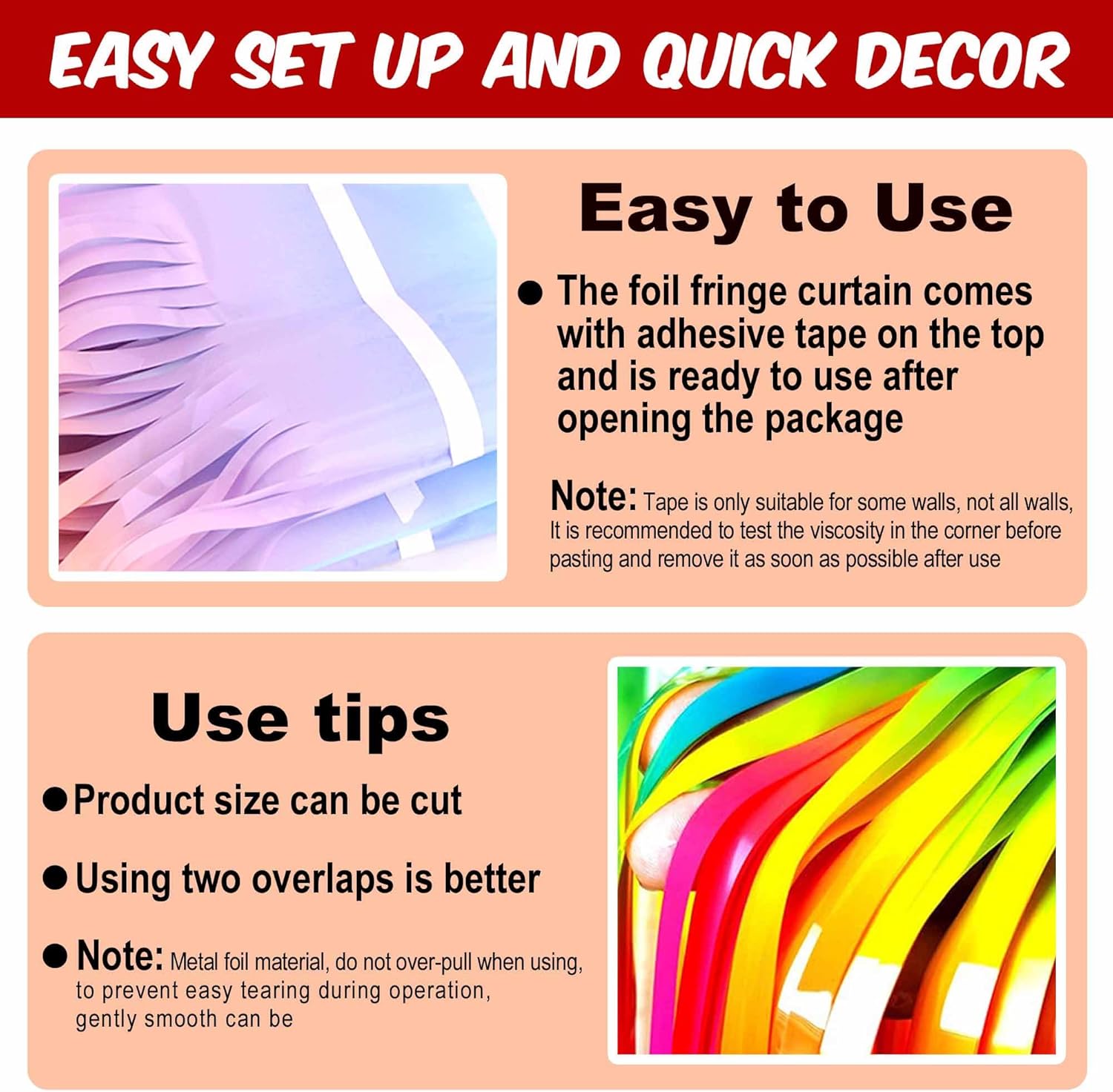 - Easy to Use: The tinsel foil fringe streamers curtain backdrop comes with double sided tape on the top, gently peel plastic strip off and it would be very easy to paste on smooth surfaces such as wall, window, table, door or anywhere you like