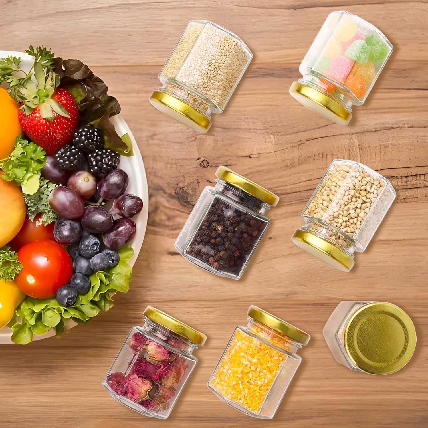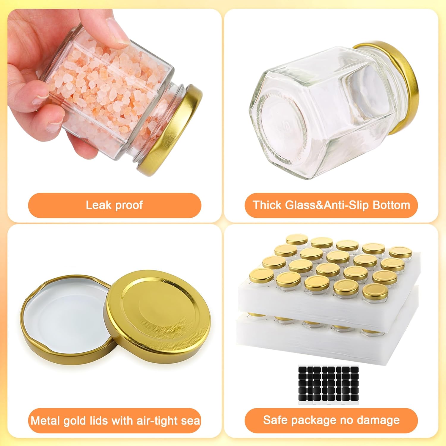 Small Glass Honey Jars with Lids 3oz,40 pack Airtight Glass Canning Jars with Gold Lids,Hexagon Glass Jars for Spice,Jam,Foods,Liquid,Baby Shower Favors,Wedding Favors,40 Labels