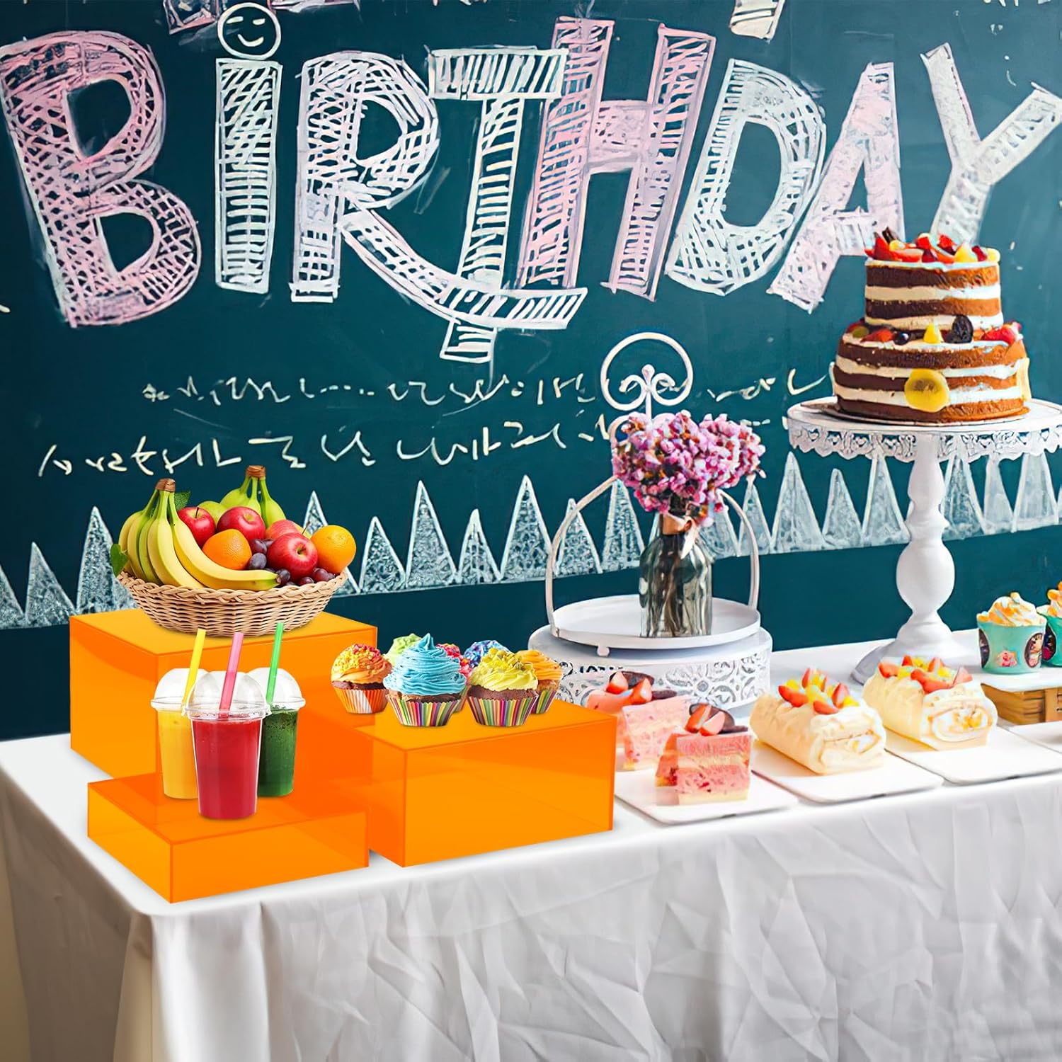 Orange Buffet Risers 3Pcs Acrylic Boxes Display Risers for Buffet Table Parties Weddings Catering Dessert (6''x7''x8'')