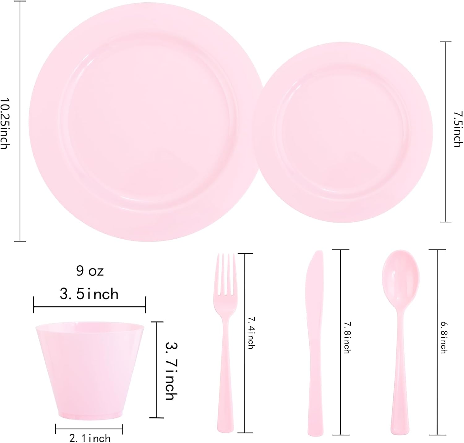 - WELL-PACKED: 150 pack includes 25 10.25" pink dinner plates25 7.5" salad plates, 25 forks , 25 knives,25 spoons,25 cups .We use durable and pretty packaging to guarantee that your Pink Dinnerware Set arrive in the best condition possible.It’s also convenient to have a outdoor picnic