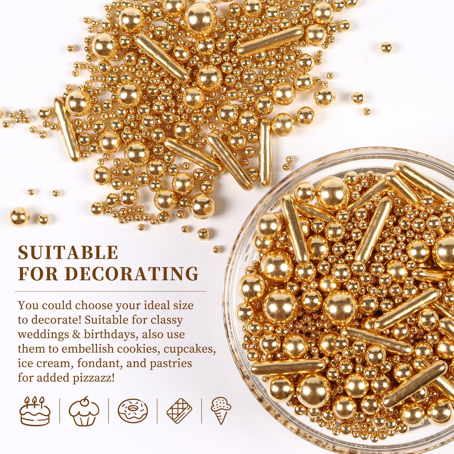 - Sprinkles for Cake Decorating: The perfect gold pearl and rod sprinkles for cakes, cupcakes, ice cream, cookies, macarons, donuts, and more. Make them sparkle and 3D. It's best for decorating after your items have already been baked, avoid melting during baking.