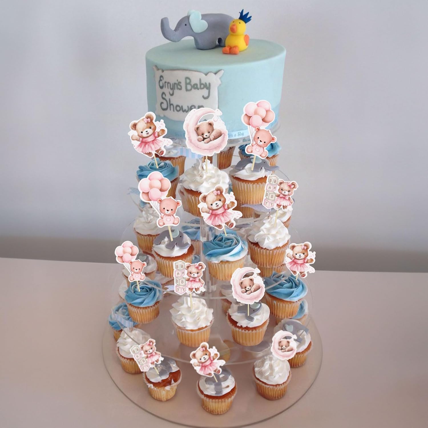 Gyufise 32Pcs Baby Shower Bear Cupcake Toppers Moon Baby Bear Baby Shower Cake Topper Decorations Jungle Animal Theme Birthday Party Cake Supplies Pink