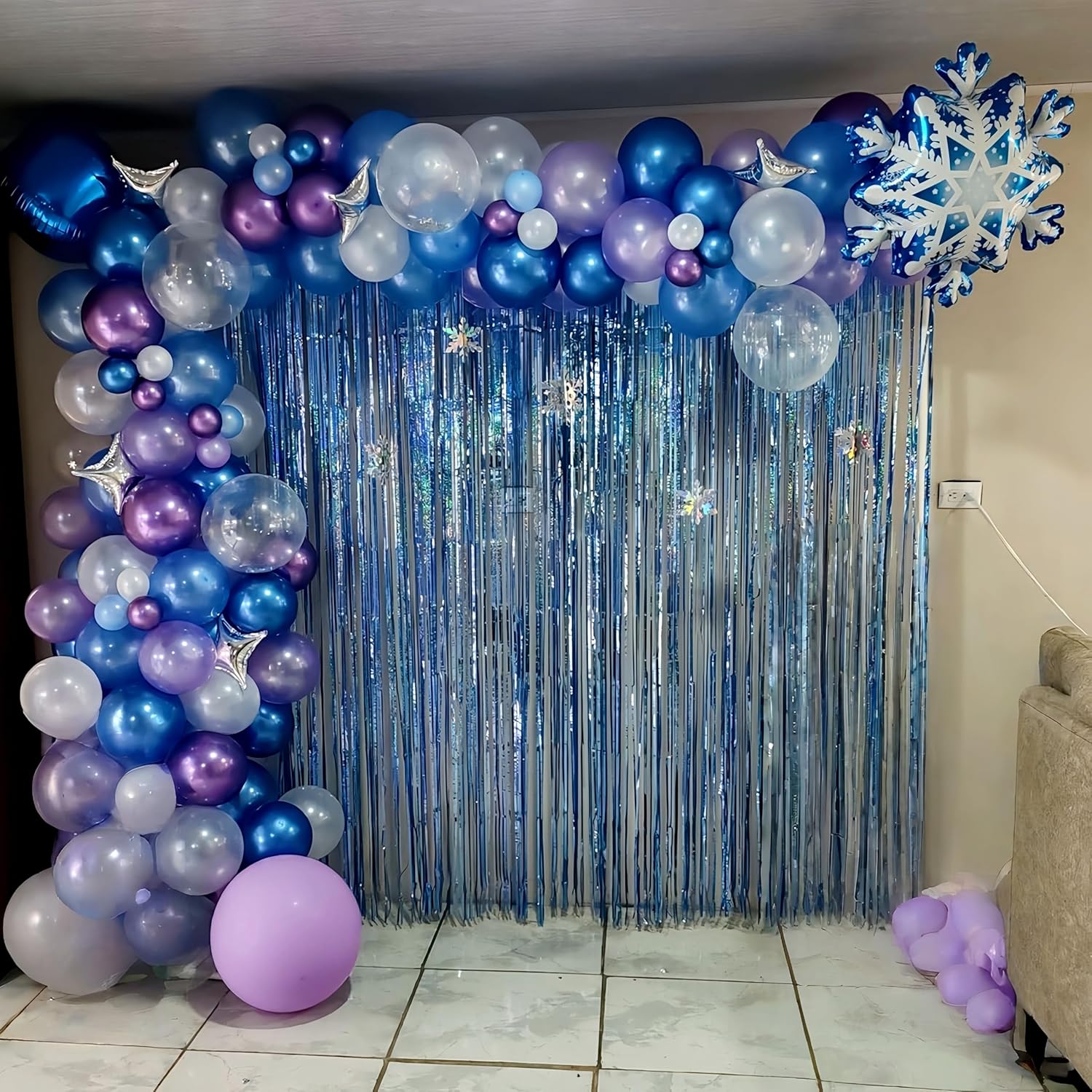 - ๐ Snowflake Balloons - You will get 35 pieces 12 inch latex party balloons set, includes light blue balloon (11pcs), metallic blue balloon (5pcs), metallic purple balloon (6pcs), metallic silver balloon (7pcs), clear snowflake balloons (6pcs), come with 1pc balloon ribbon. Perfect for women men birthday baby bridal shower wedding winter wonderland party decorations supplies.
