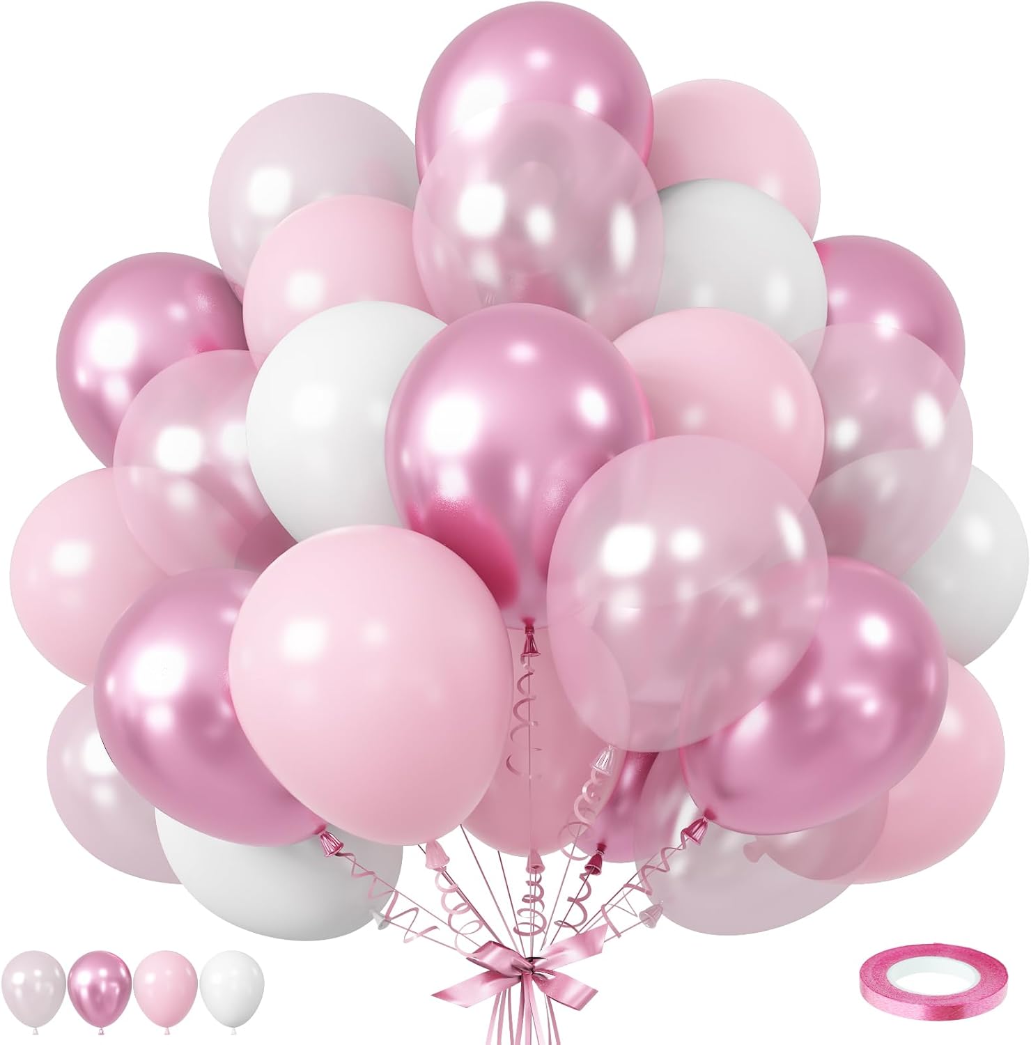 - Pink Balloons Set: 35pcs 12 inch Balloons set, include 10pcs metallic pink balloons, 10pcs macaron pink balloons, 7pcs pearl pink balloons, 8pcs matte white balloons and 1pc white ribbon.
