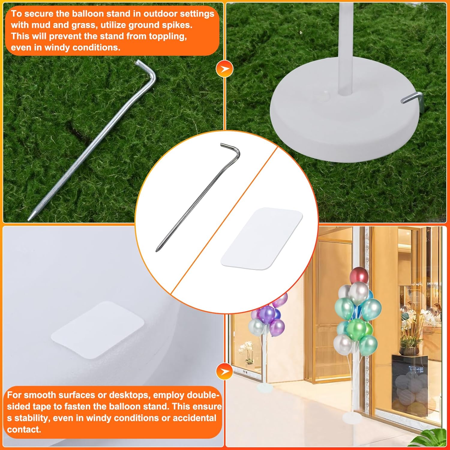 - [UPGRADED BASE] - Enhanced Stability for Windy Areas: When using the balloon stand in windy conditions, simply filling the base with water might not be enough to prevent tipping. That's why we provide floor spikes and double-sided tape to secure the balloon stand based on your specific situation. Use the double-sided tape for flat floors or table tops, and the ground spikes for grassy areas. No more worrying about balloon stands being blown over by the wind!