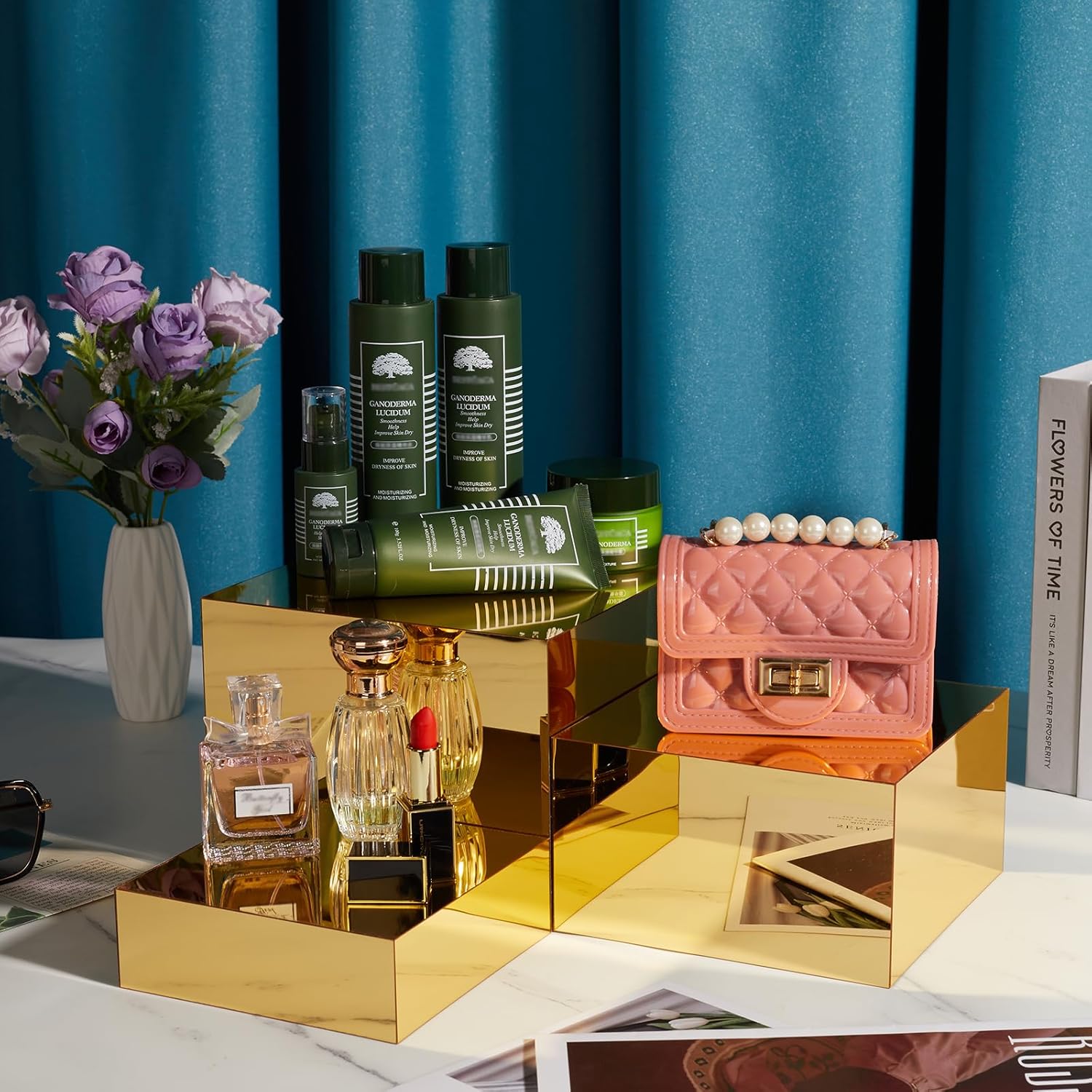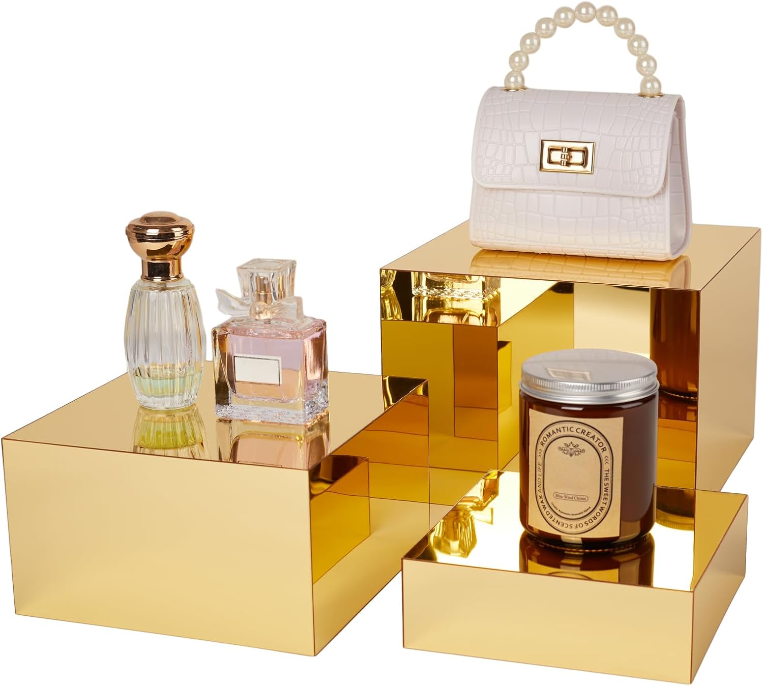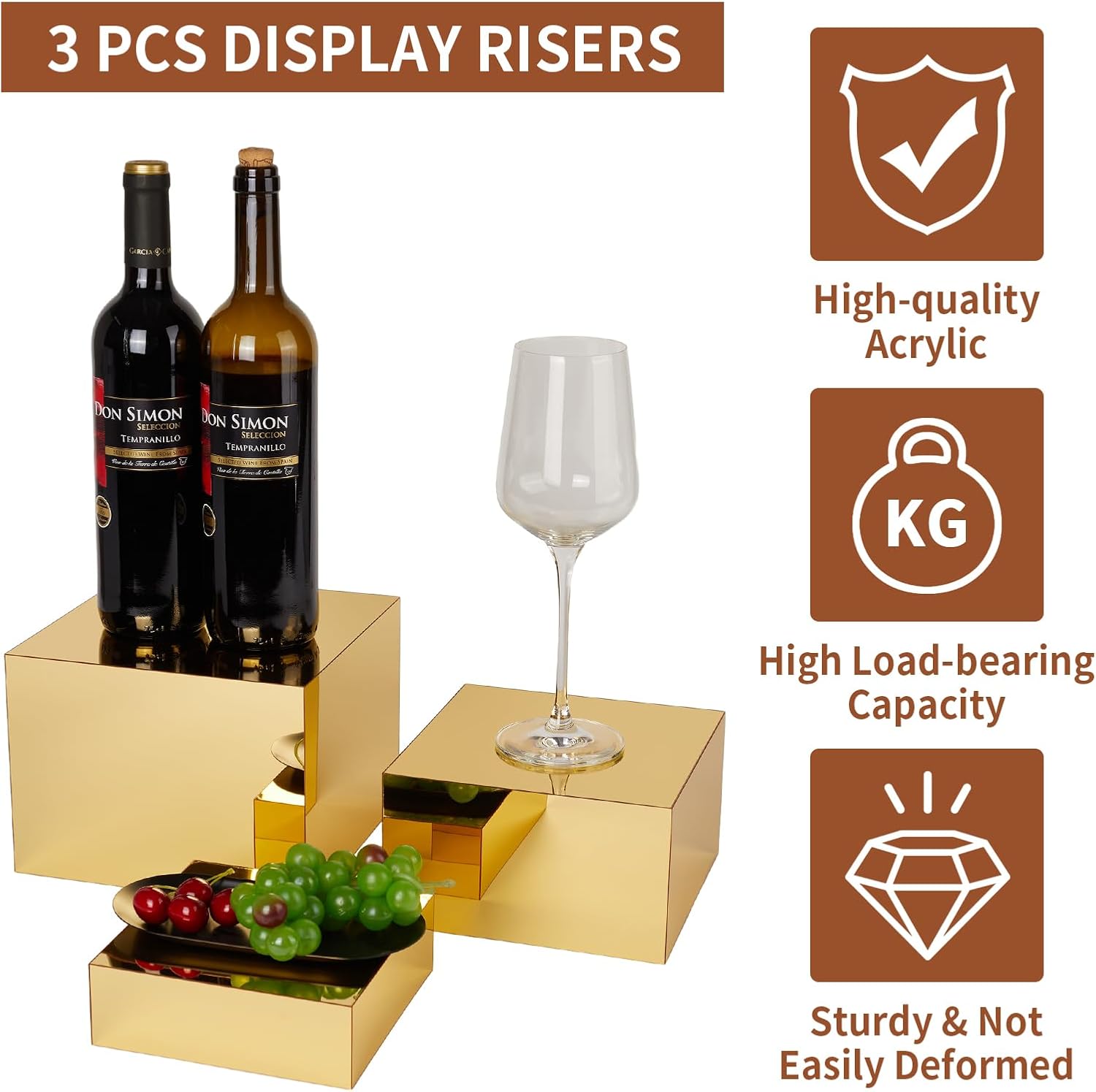 3 Pcs Acrylic Risers for Display, Acrylic Cube Boxes Gold Risers Food Display Risers Stand Shelf for Catering Dessert Collectibles Jewelry Figures Party (Gold 3pc)