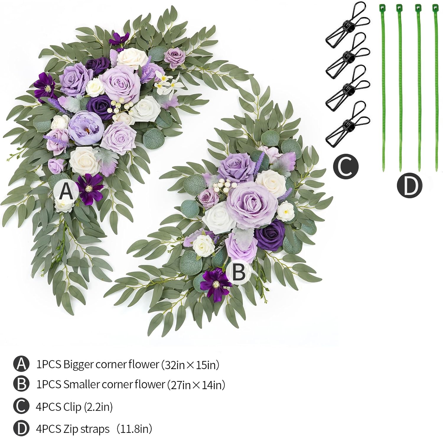 - ❤️Size&Package: The large arch flower design straightens measures 32" long x 18" wide, small flower tie measures 23" long x 14" wide.arch flower swags x2 + cable zip tie x6 + metal clip x4 Ready to use straight out the box and easy to assemble.Comes with easy cable ties included for simple attachment anywhere.