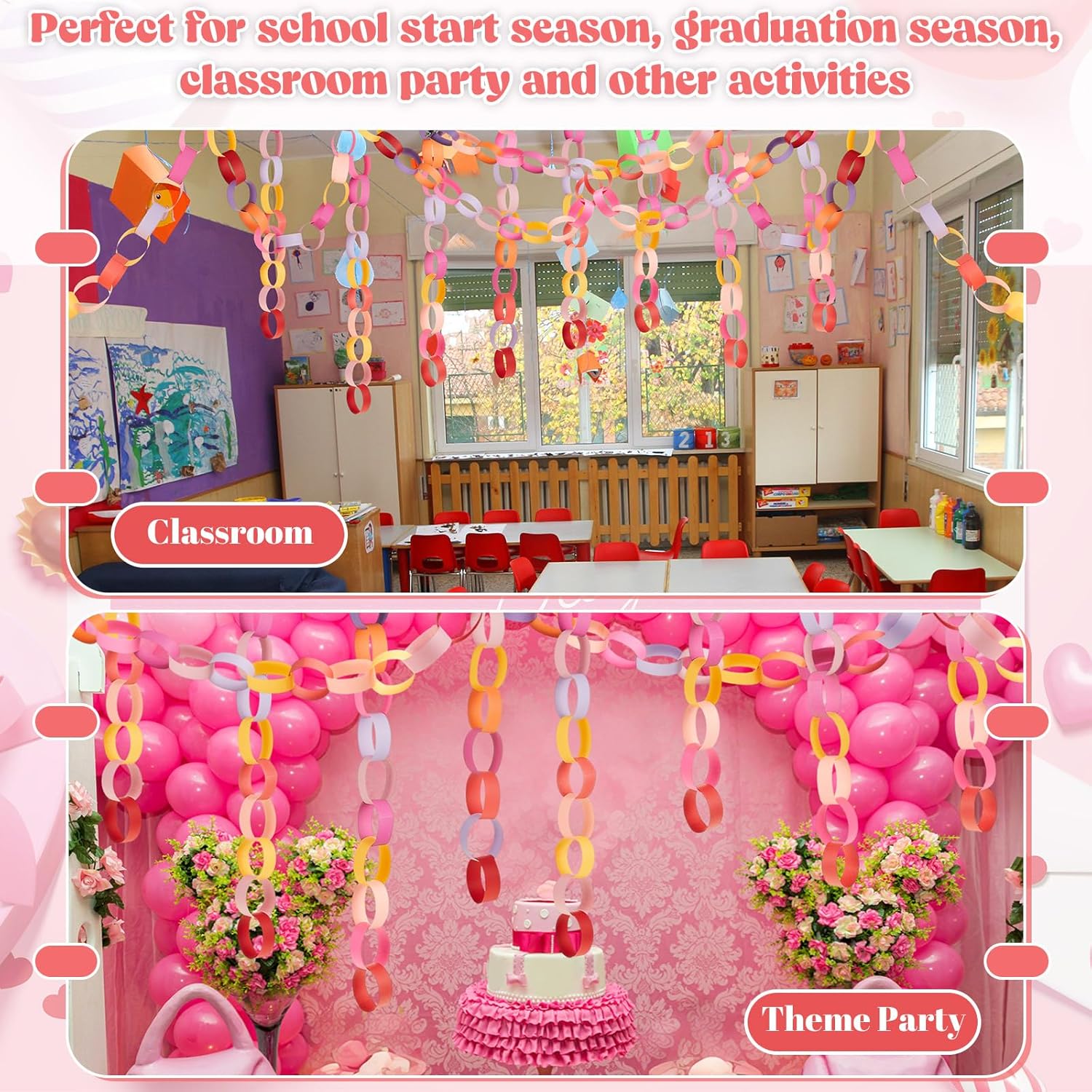 - Abundantly Colorful Paper Strips: the color palette is bountiful with our 600 sheets paper chain strips, equipped with 2 rolls of double sided tapes; The abundant quantity means you can create a paper chain that can stretch up to 114 feet in total length; The multitude of colors available broadens your design spectrum, bringing out ingenuity and creativity