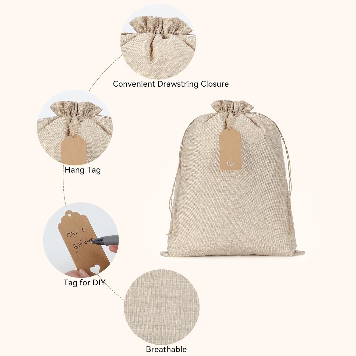 Tapleap Burlap Gift Bags with Drawstring - 10Pcs 12x16 Original Sacks with String and Tags for Wrapping Halloween Favors, Breads, Wine, For Birthday, Wedding or Household Use