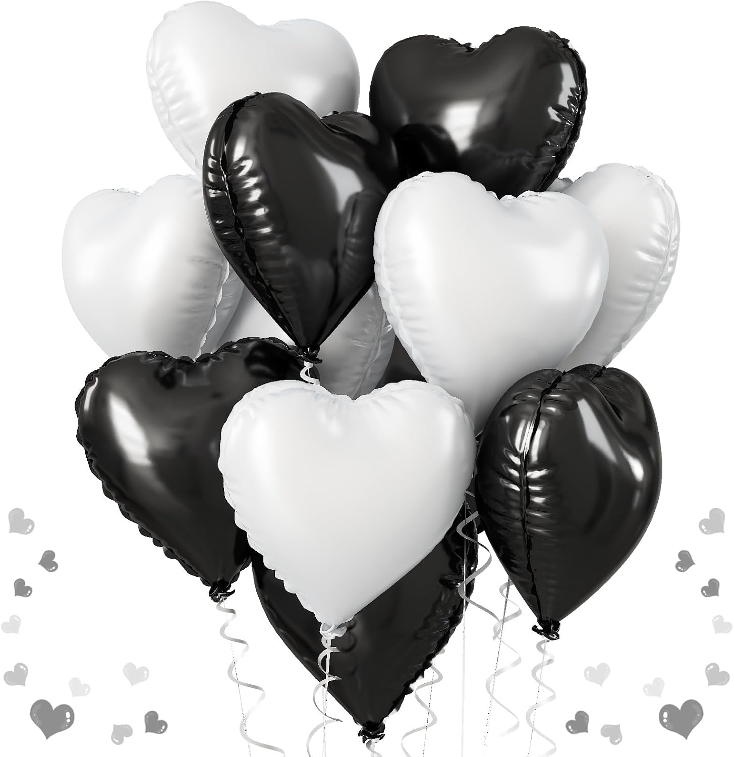 - Black White Heart Balloons: 10pcs 18 inch heart foil balloons, Includes 5pcs 18inch white heart foil balloons, 5pcs 18inch black heart foil balloons and 1pc ribbons.
