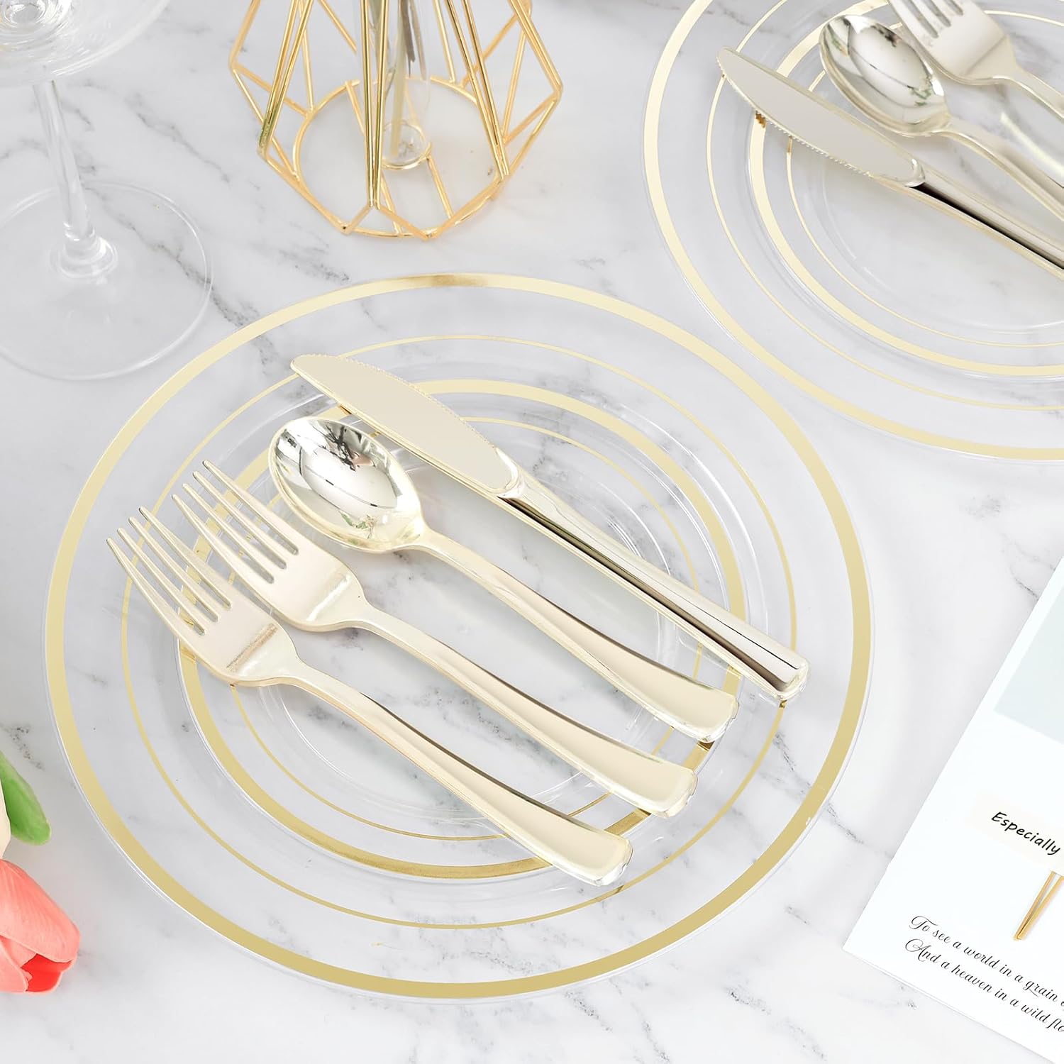 300PCS Clear Gold Plastic Plate Set (50 Guests), Disposable Dinnerware Set for Party, Wedding, Birthday - 100 Plates, 100 Forks, 50 Spoons, 50 Knives for Christmas, Thanksgiving