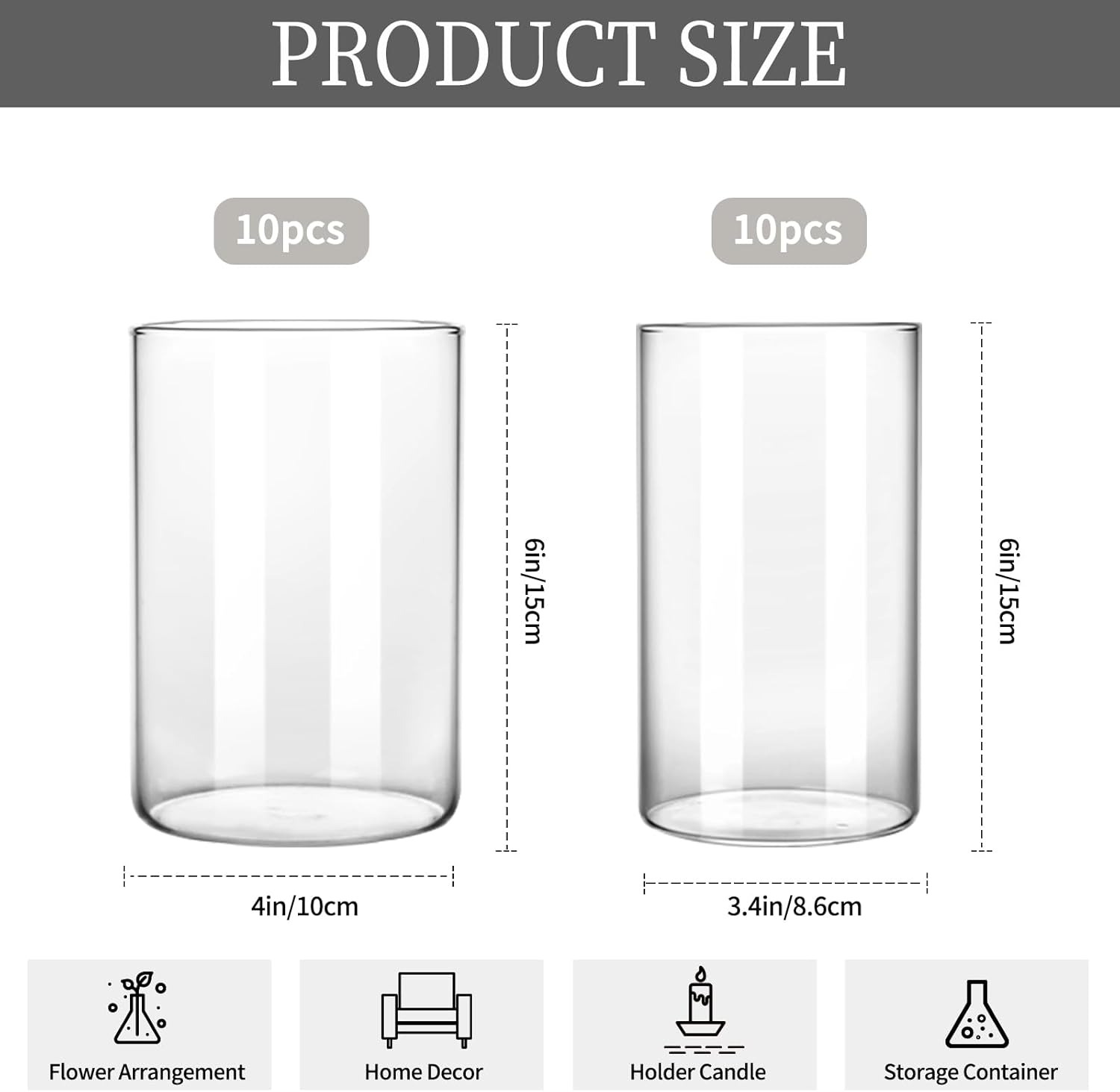 - Package contains: The set contains 20 glass cylinder vases, 10 pack 6" height & 4" bottom diameters, and 10 pack 6" height & 3.4" bottom diameters. The 3.4-inch glass vase can perfectly match your 3-inch candle, and the 4-inch glass vase can be used for flower arrangements. The combination can meet your different needs.