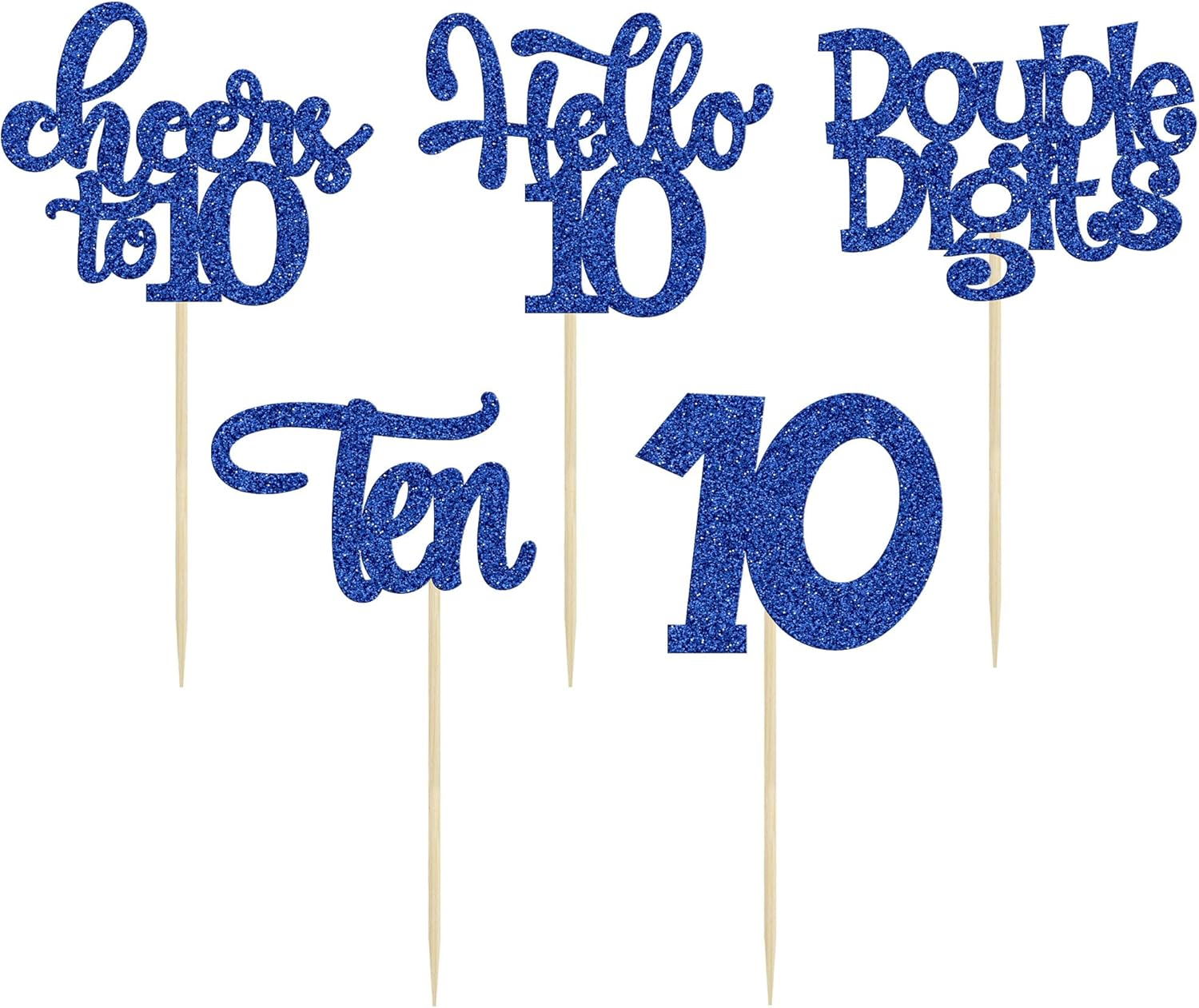 30Pcs 10th Birthday Cupcake Toppers Ten Double Hello 10 Cupcake Picks Cheers to 10 Years Old Cake Decorations for 10th Birthday Party Supplies Deep Blue Glitter