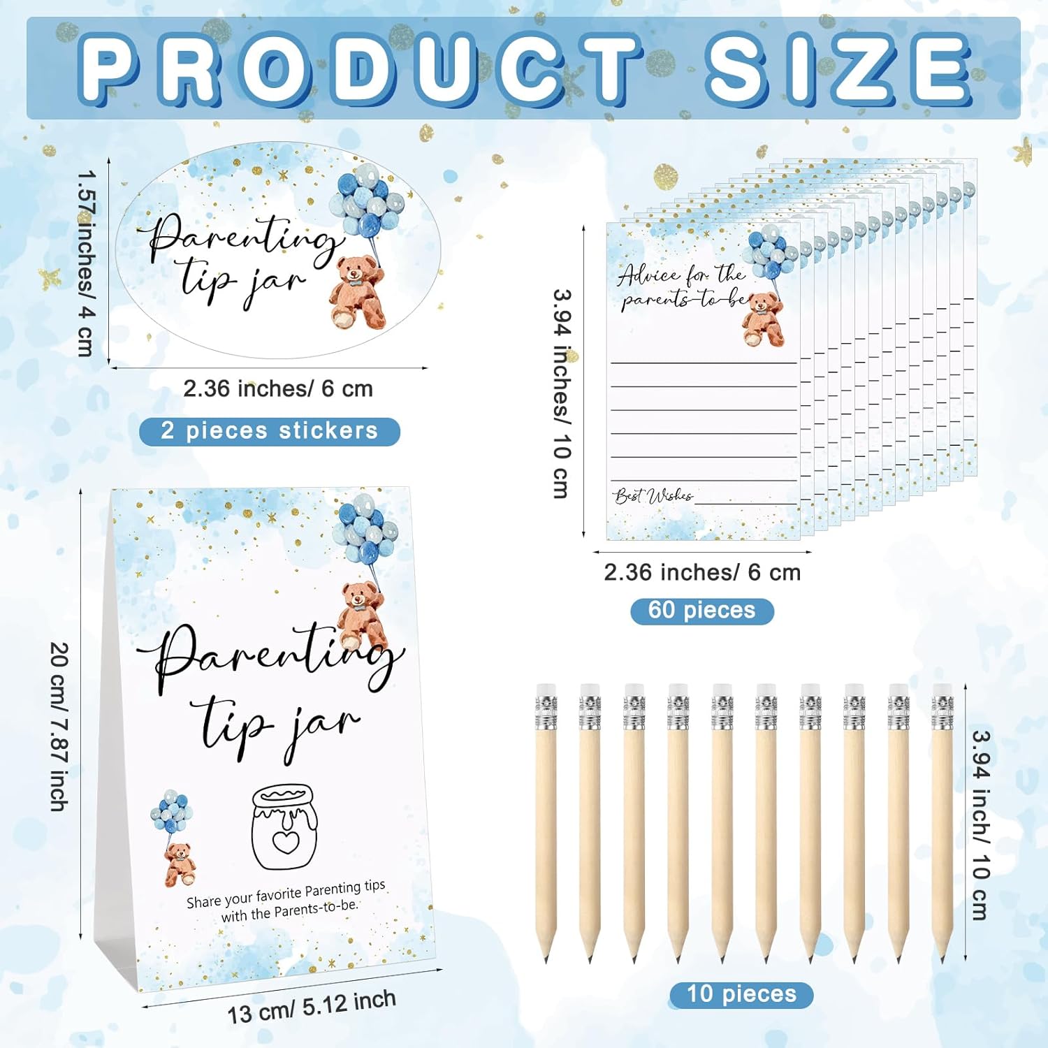 - Baby Shower Cards Set: the package contains 1 piece of parenting tip jar sign, 60 pieces of tips cards for the parents to be, 10 pieces of pencils, 2 pieces of cute stickers, and 1 PET bottle, enough quantity and delicate design to meet your use needs