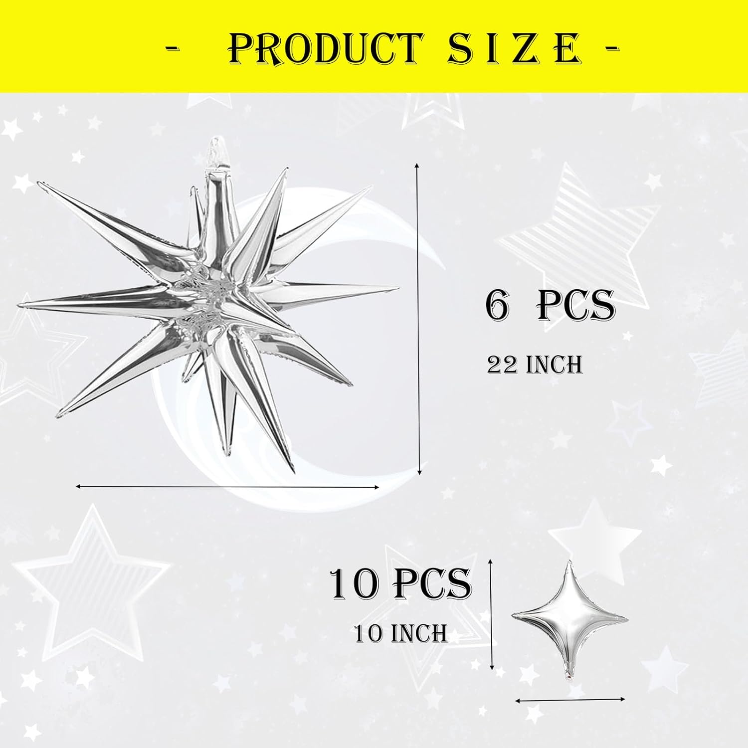 - ăPackageăYou will get 6 pack 22 inch silver explosion star balloons, 10pcs 10 inch four pointed star balloons, very elegant and super valuable.