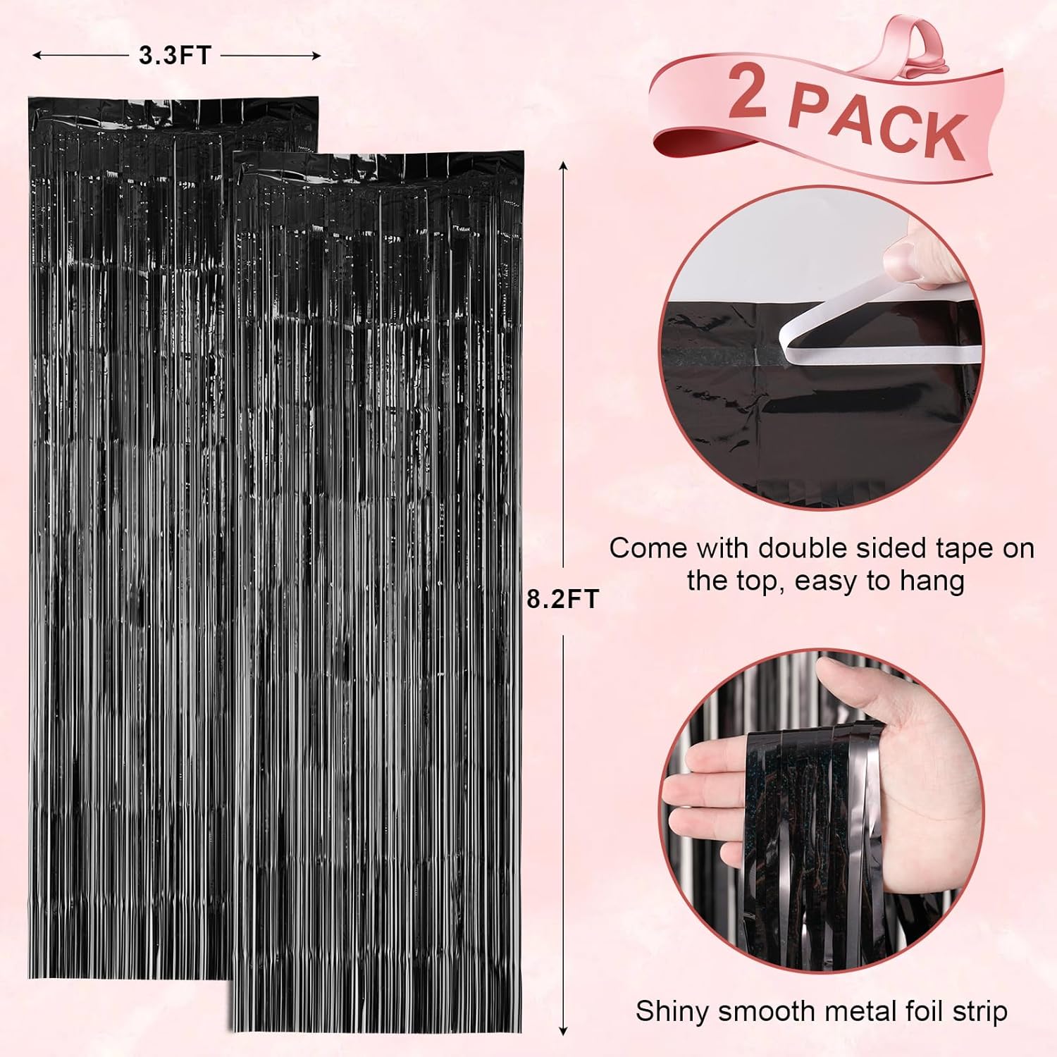 2 Pack Laser Black Foil Fringe Backdrop Curtains, Tinsel Streamers Birthday Party Decorations, Fringe Backdrop for Graduation, Baby Shower, Gender Reveal, Disco Party