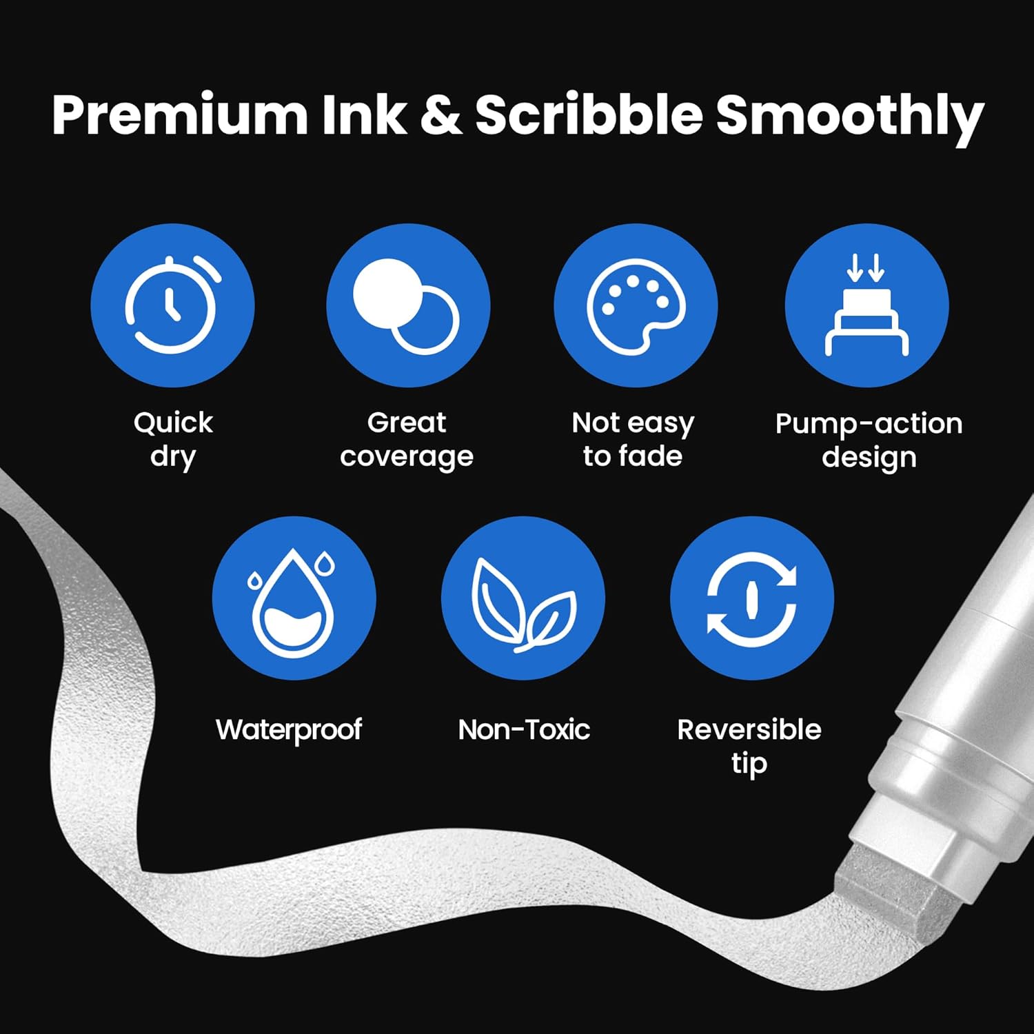 - Jumbo Permanent Markers silver Set: BIGTHUMB jumbo silver markers are made with the highest-quality non-toxic, acid-free, no odor, no-leakage water-based acrylic ink that is waterproof, quick dry, long-lasting, and smooth ink flow. Each fat permanent marker conforms to ASTM d-4236 and EN-71 safety standards