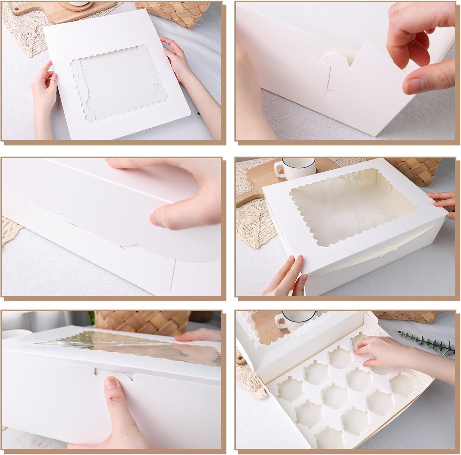 - EASY TO ASSEMBLE - Our cupcake box comes flat and pre-folded, which is easy and quick to fold and assemble box without glue or other tools. In order to achieve the perfect effect, please assemble the box according to the indentation of the bakery box.