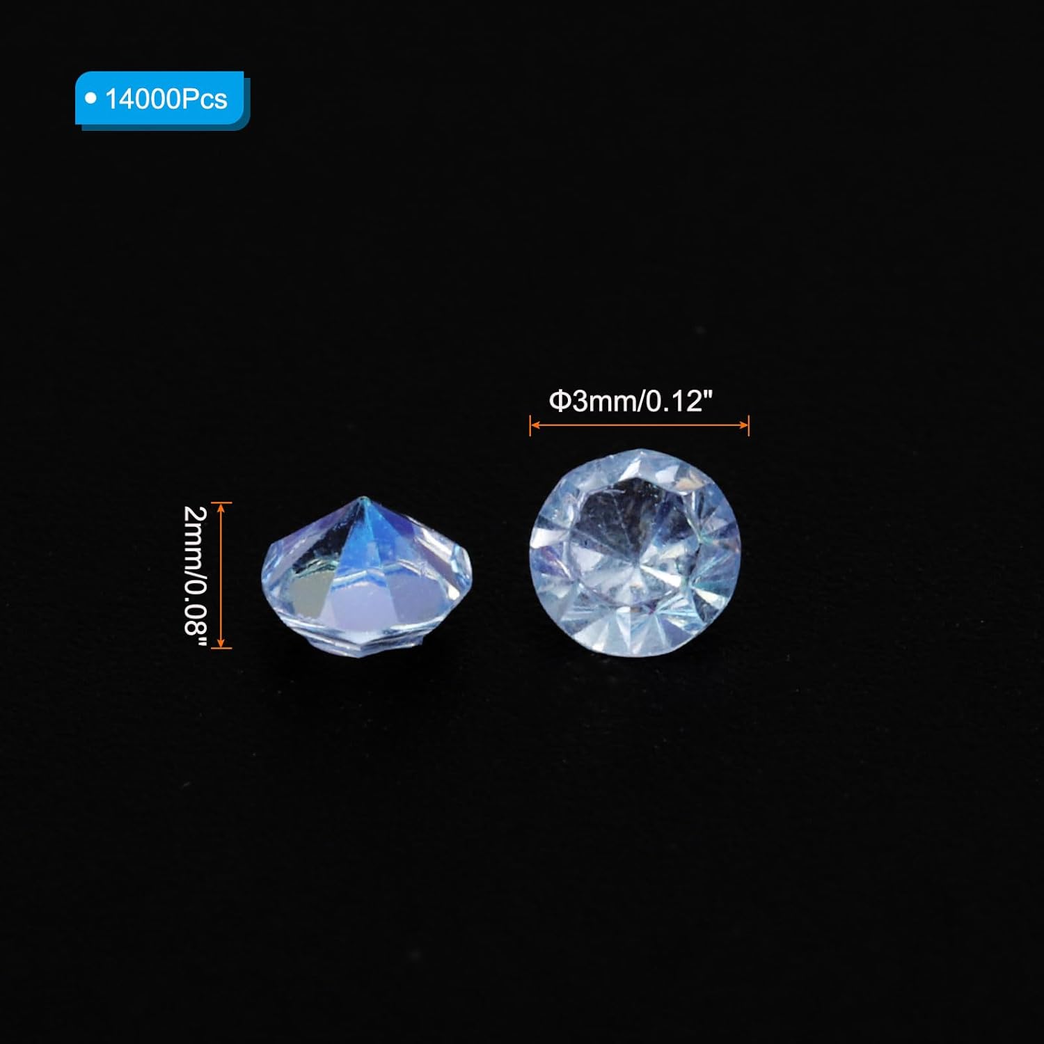 - Color: Light Blue AB; Material: Acrylic; Size: 3mm x 2mm/ 0.12 x 0.08 inch (Dia.x H); Packing List: 14000Pcs x Acrylic crystal diamonds