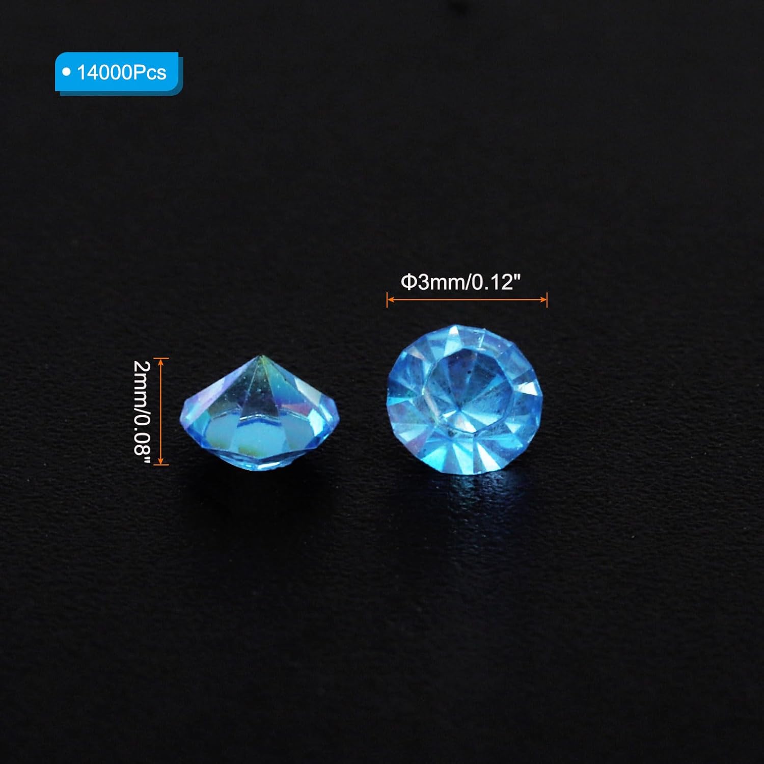 - Color: Blue AB; Material: Acrylic; Size: 3mm x 2mm/ 0.12 x 0.08 inch (Dia.x H); Packing List: 14000Pcs x Acrylic crystal diamonds