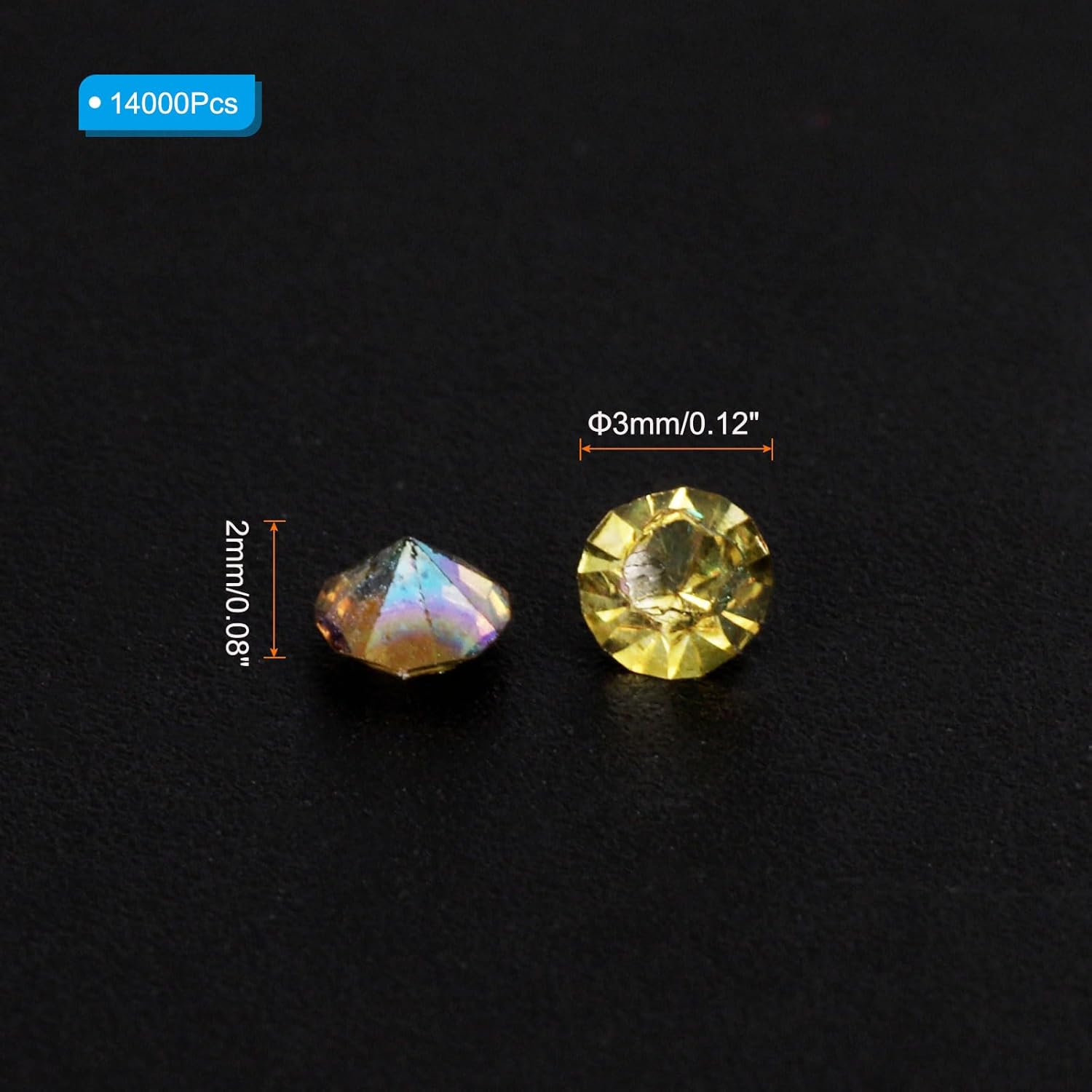 - Color: Olive Green AB; Material: Acrylic; Size: 3mm x 2mm/ 0.12 x 0.08 inch (Dia.x H); Packing List: 14000Pcs x Acrylic crystal diamonds