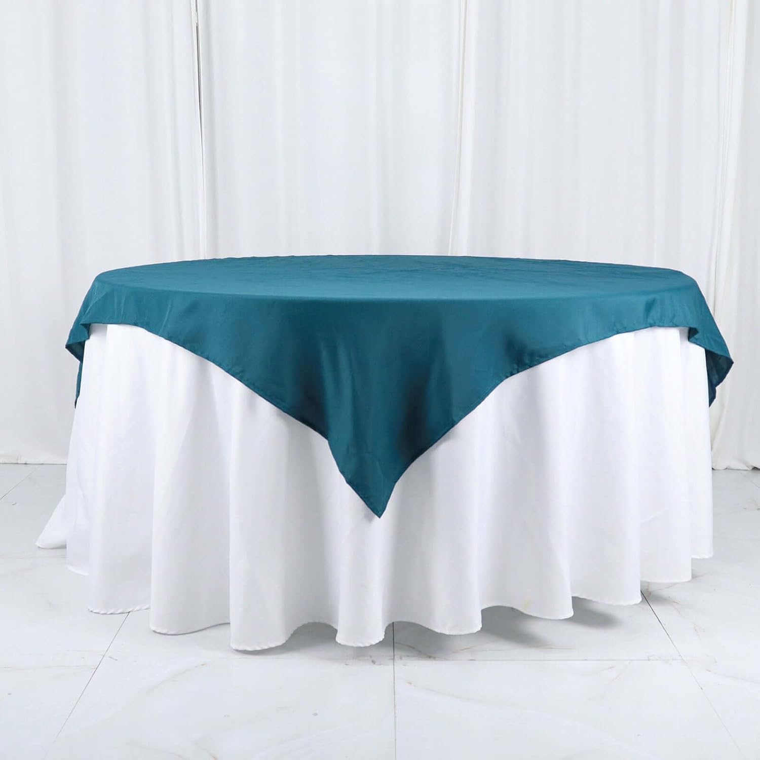 - Quantity: 1 Square Tablecloth Material: 100% Polyester Color: Peacock Teal Size: 54" x 54" Stain & wrinkle resistant, machine washable 1 piece, seamless design Hemmed edges for an exquisite look.