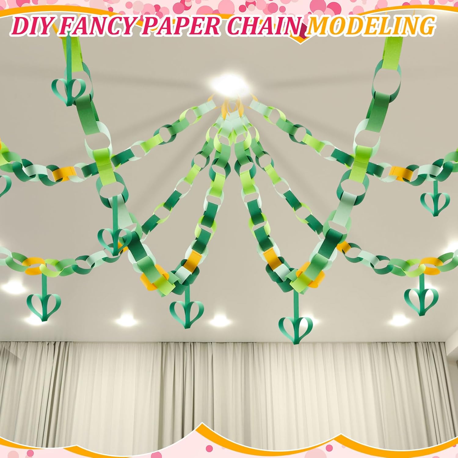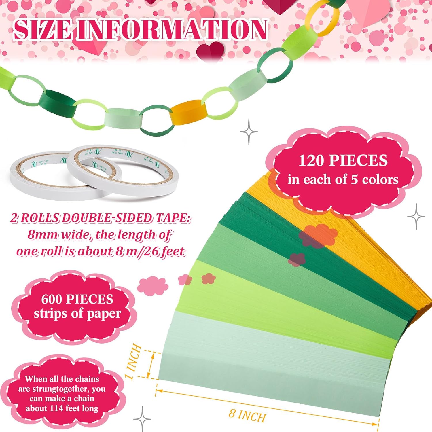 - Abundantly Colorful Paper Strips: the color palette is bountiful with our 600 sheets paper chain strips, equipped with 2 rolls of double sided tapes; The abundant quantity means you can create a paper chain that can stretch up to 28 feet in total length; The multitude of colors available broadens your design spectrum, bringing out ingenuity and creativity