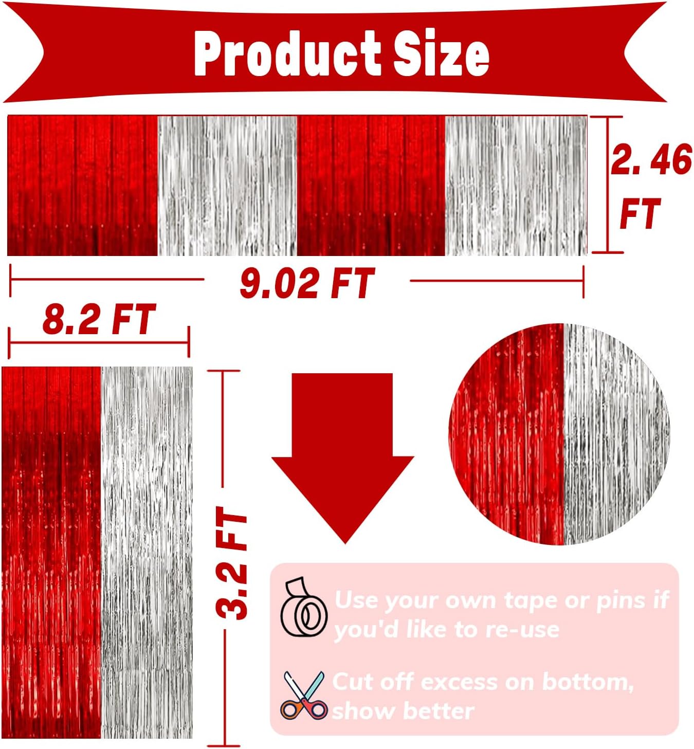 4P Metallic Foil Fringe Tinsel Table Skirts for Rectangle Tables Backdrop Banner Streamer Garland Curtains for Parade Floats Wedding Graduation Anniversary Birthday Parties Decoration(Red Silver)