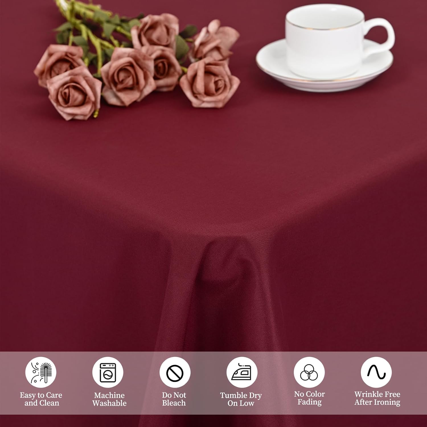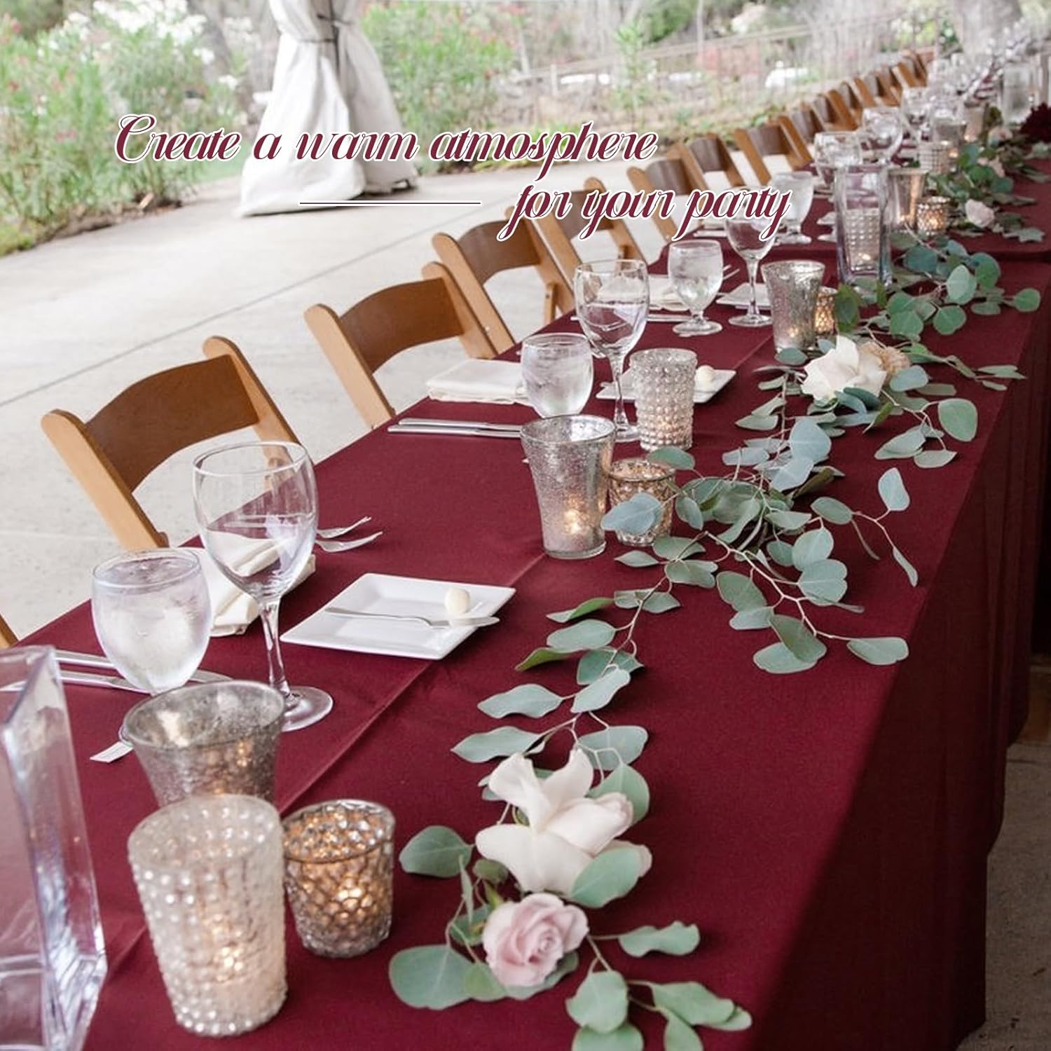 - šć Package IncludećYou will receive 12 packs of 60x102 Inch burgundy rectangle polyester tablecloths, perfect for standard 6ft table, providing 15 inch drop. The product comes individually packaged in a re-sealable storage bag. Burgundy tablecover is more luxurious, classic and gracious, ideal for both formal & casual settings and makes a great gift for all occasions. Protect your table from scratch,stains and sun rays while decorate your table. Quality of 12 packs is sufficient for your needs.
