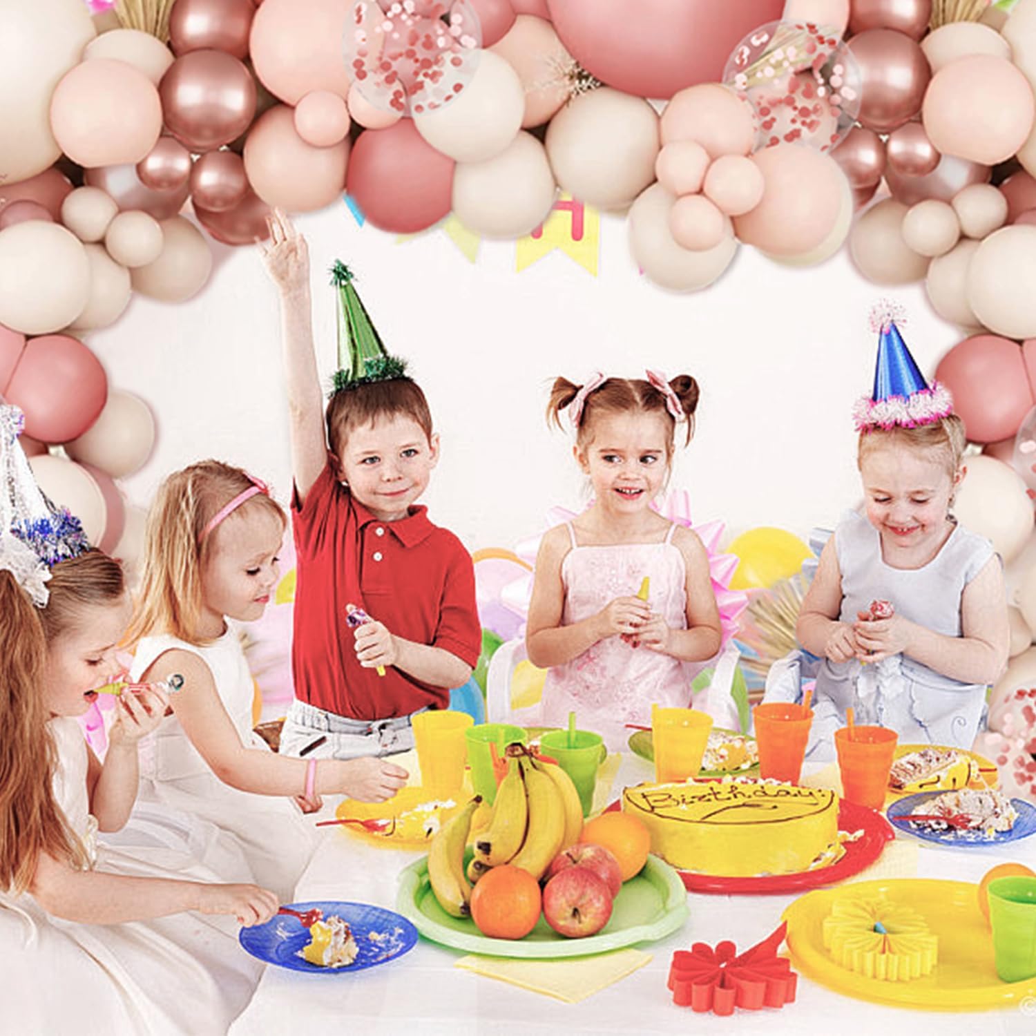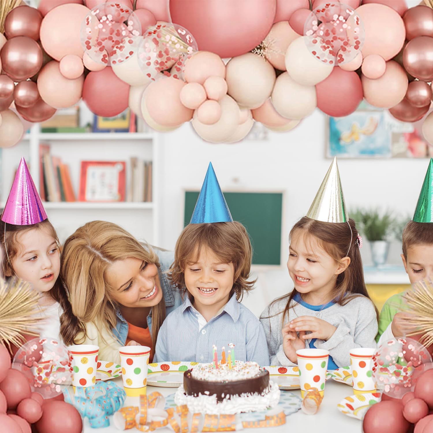- 【Balloon Arch Kit】: 144 pcs blush pink balloons include 32pcs 5/10/18 inch retro pink balloons, 42pcs 5/10/18 inch sand white balloons, 20pcs 5/10 inch rose gold balloons, 40pcs 5/10 inch pastel orange balloons, 10pcs 12 inch rose gold confetti balloons, 1 roll of decorative strip and 5pcs dots glue.