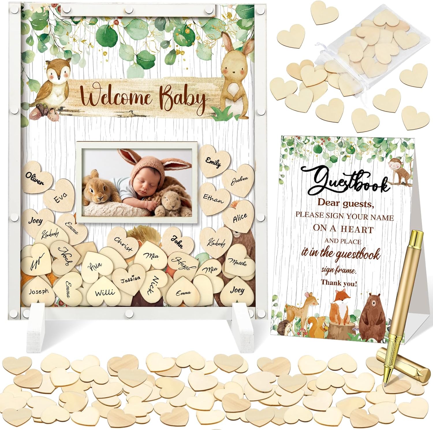 - Woodland Animal Baby Shower Decorations: you will receive a woodland animal theme baby shower guest book with photo frame in 11.81 x 13.78 inches/ 30 x 35 cm, a pen, 60 woodland animal wood cutouts, 1 organza bag, 2 display shelves, enough to meet the needs of your woodland animal themed baby shower party
