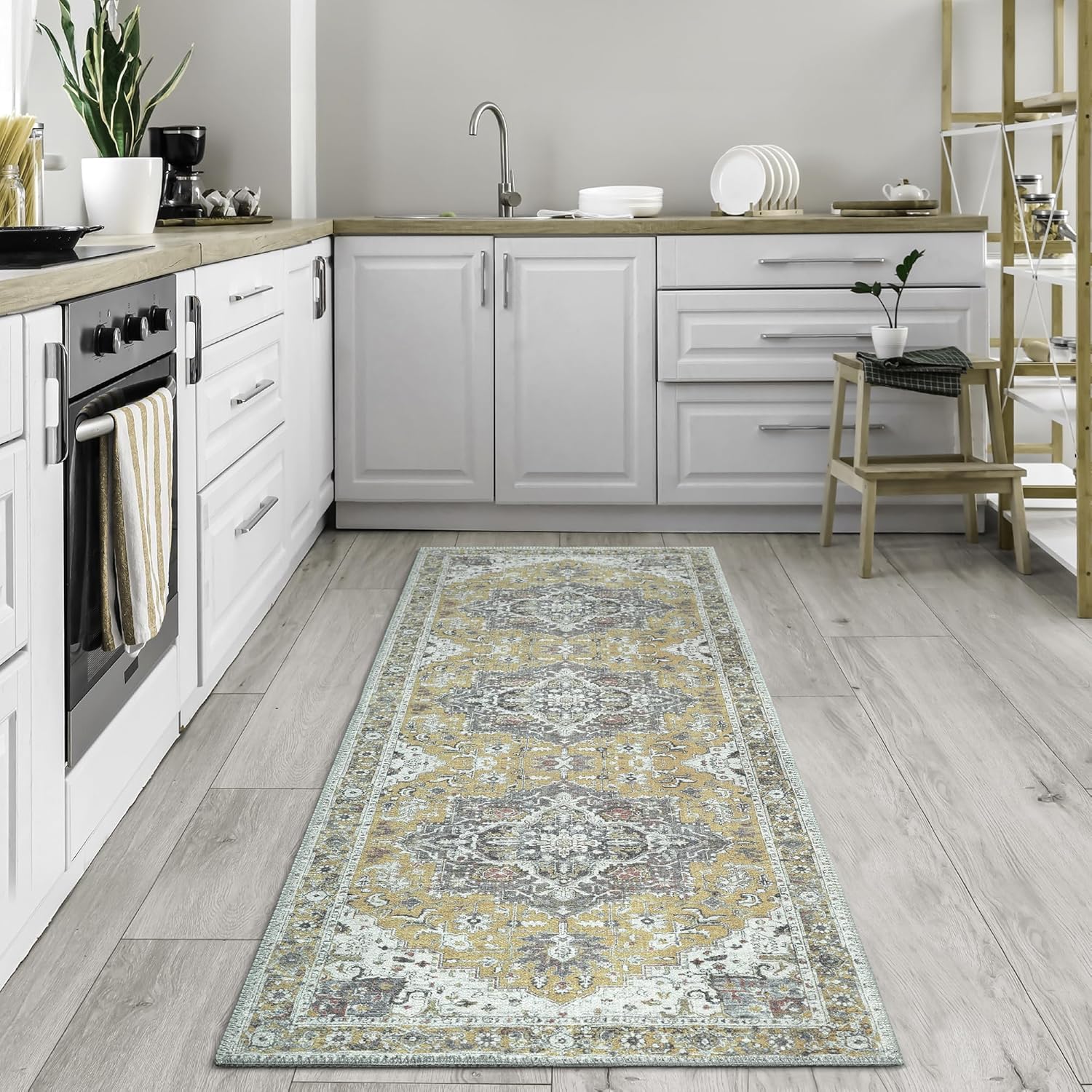 Bloom Rugs Washable Non-Slip 10 ft Runner - Yellow Traditional Medallion Runner for Entryway, Hallway, Bathroom, and Kitchen - Exact Size: 2.5' x 10'
